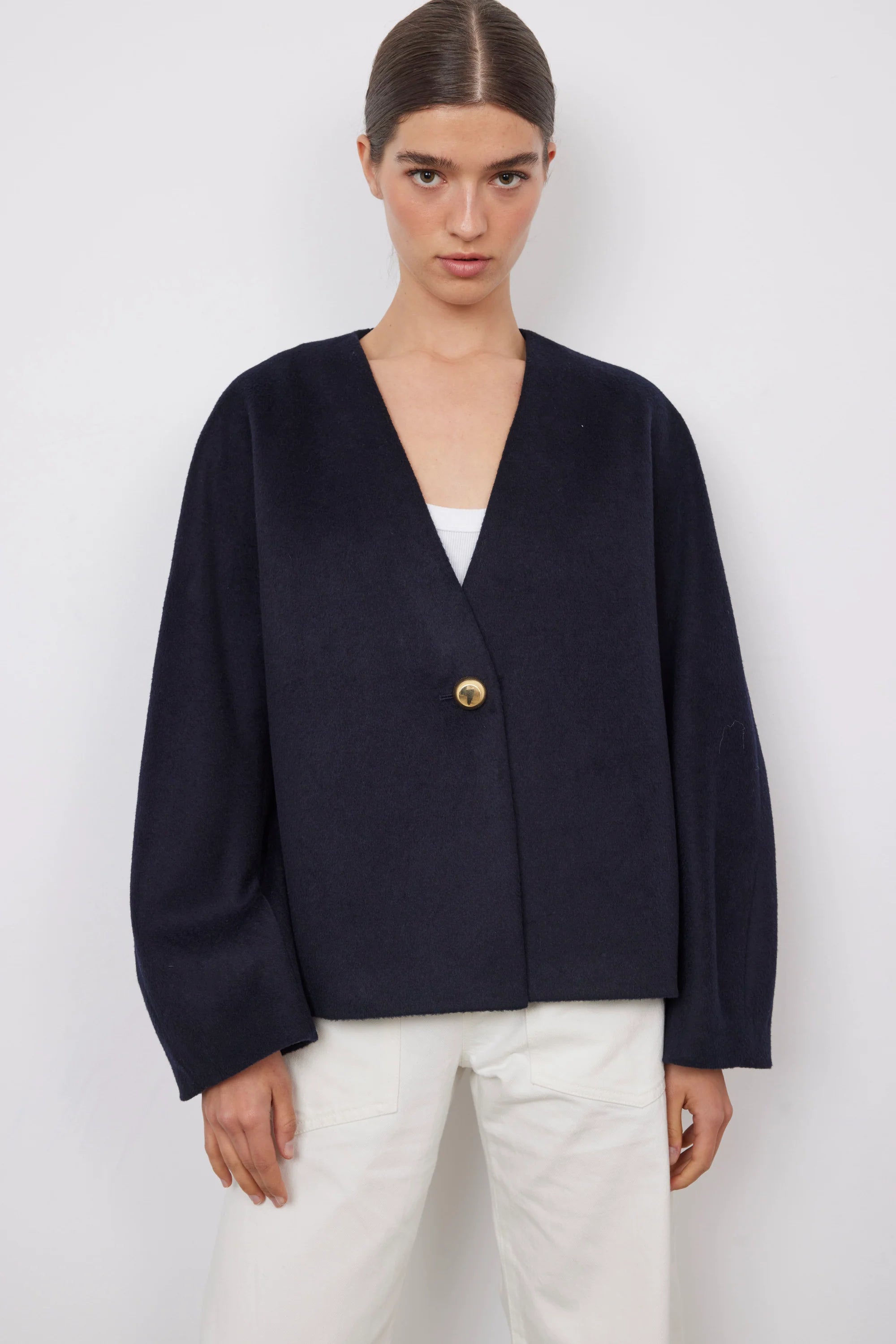 Abrigo Colección Bad Habits. Abrigo corto de manga larga, de mezcla de lana. Con cierre mediante botón joya dorado. Estilo japonés con hombros caídos.