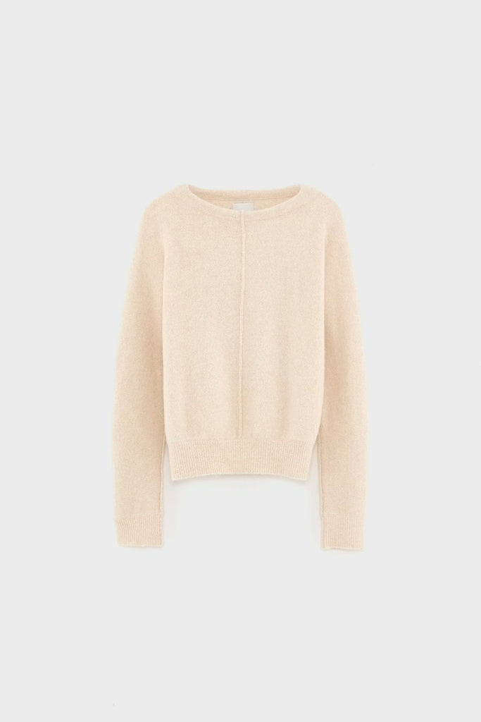 Suéter clásico de mezcla de lana de color blanco roto con detalle de costura visible en la parte delantera y trasera.