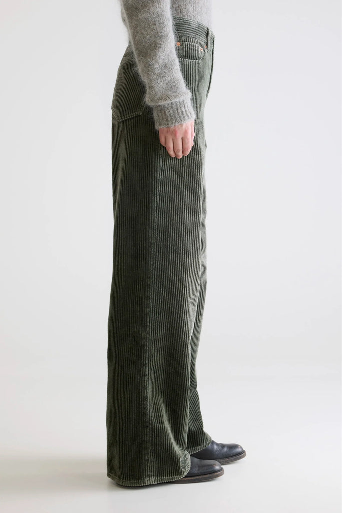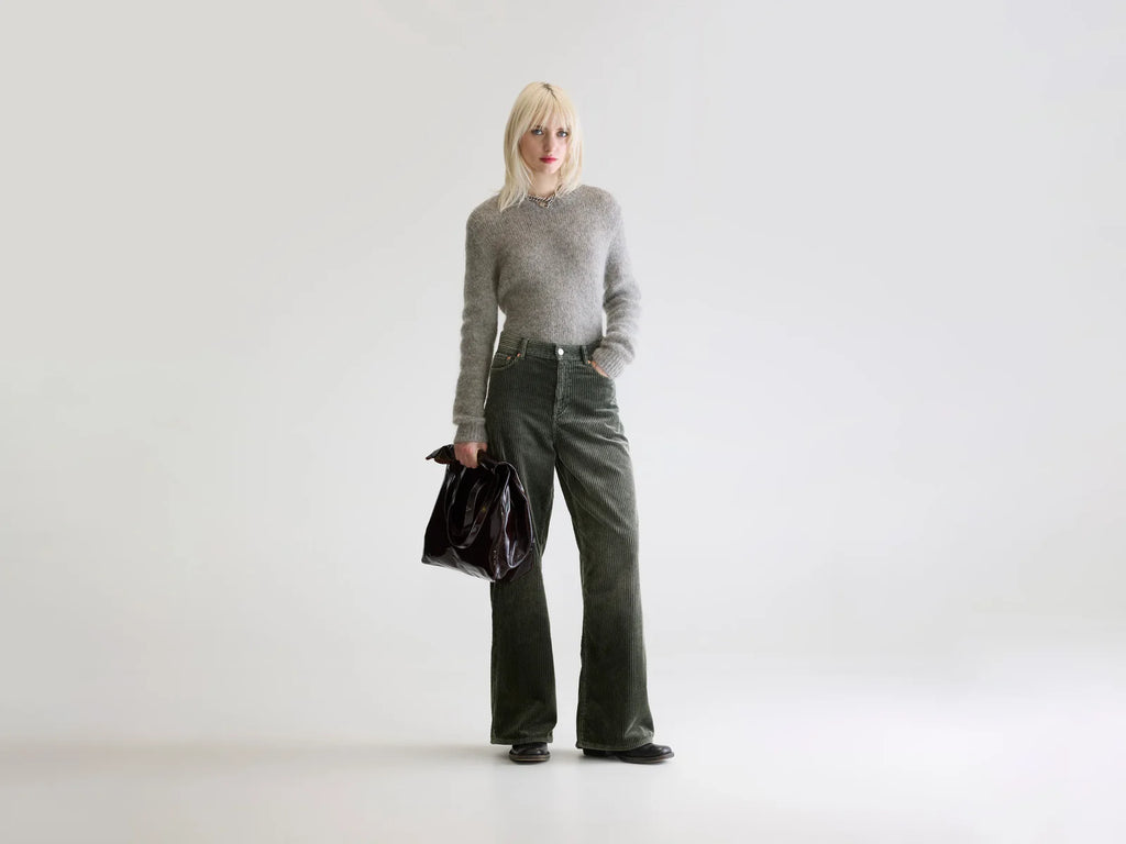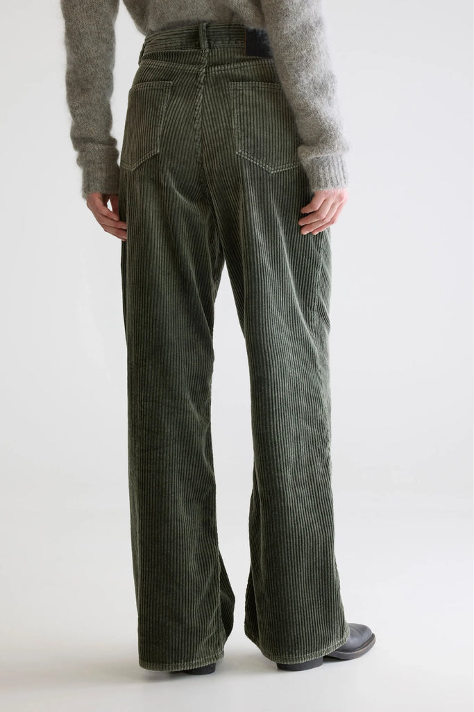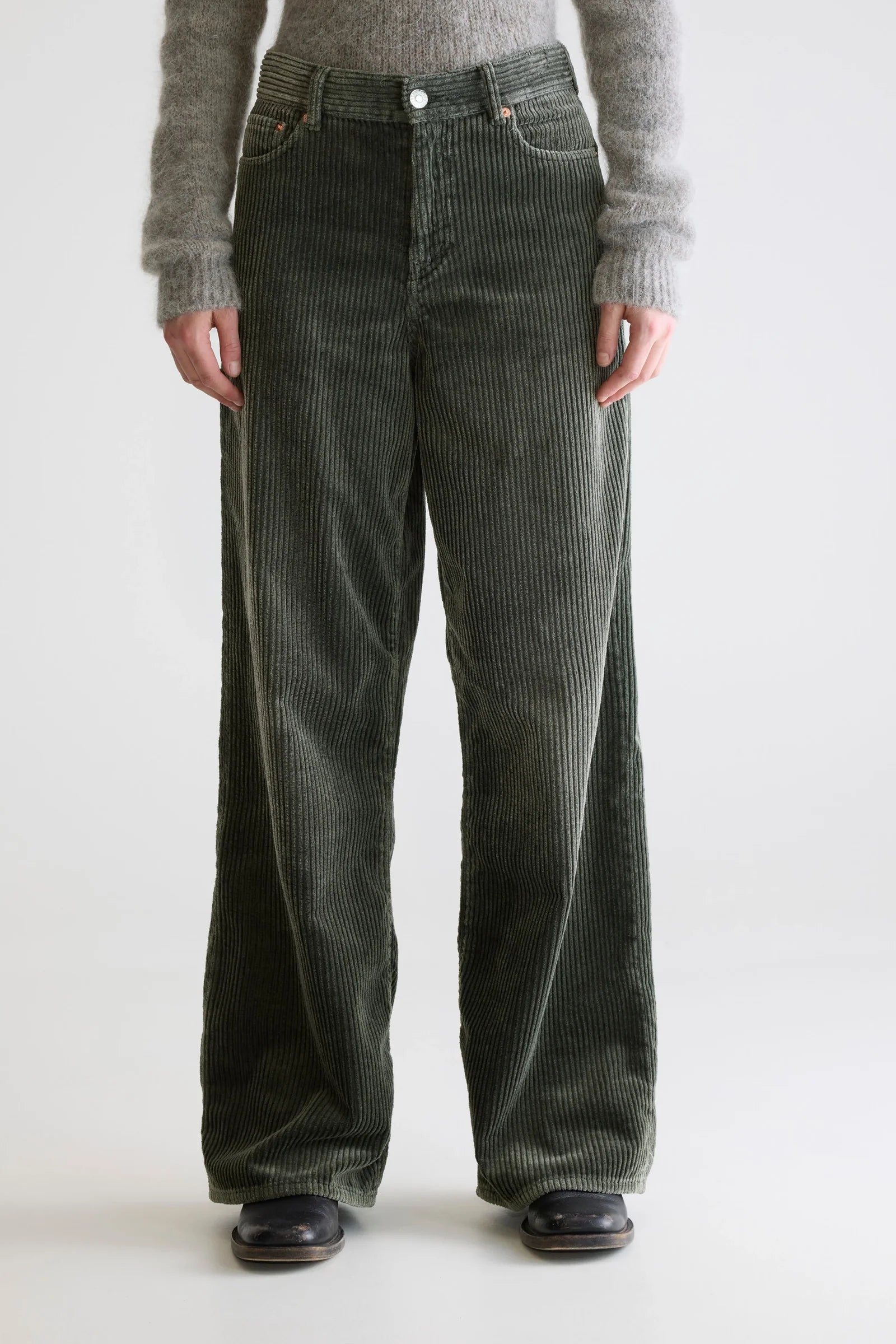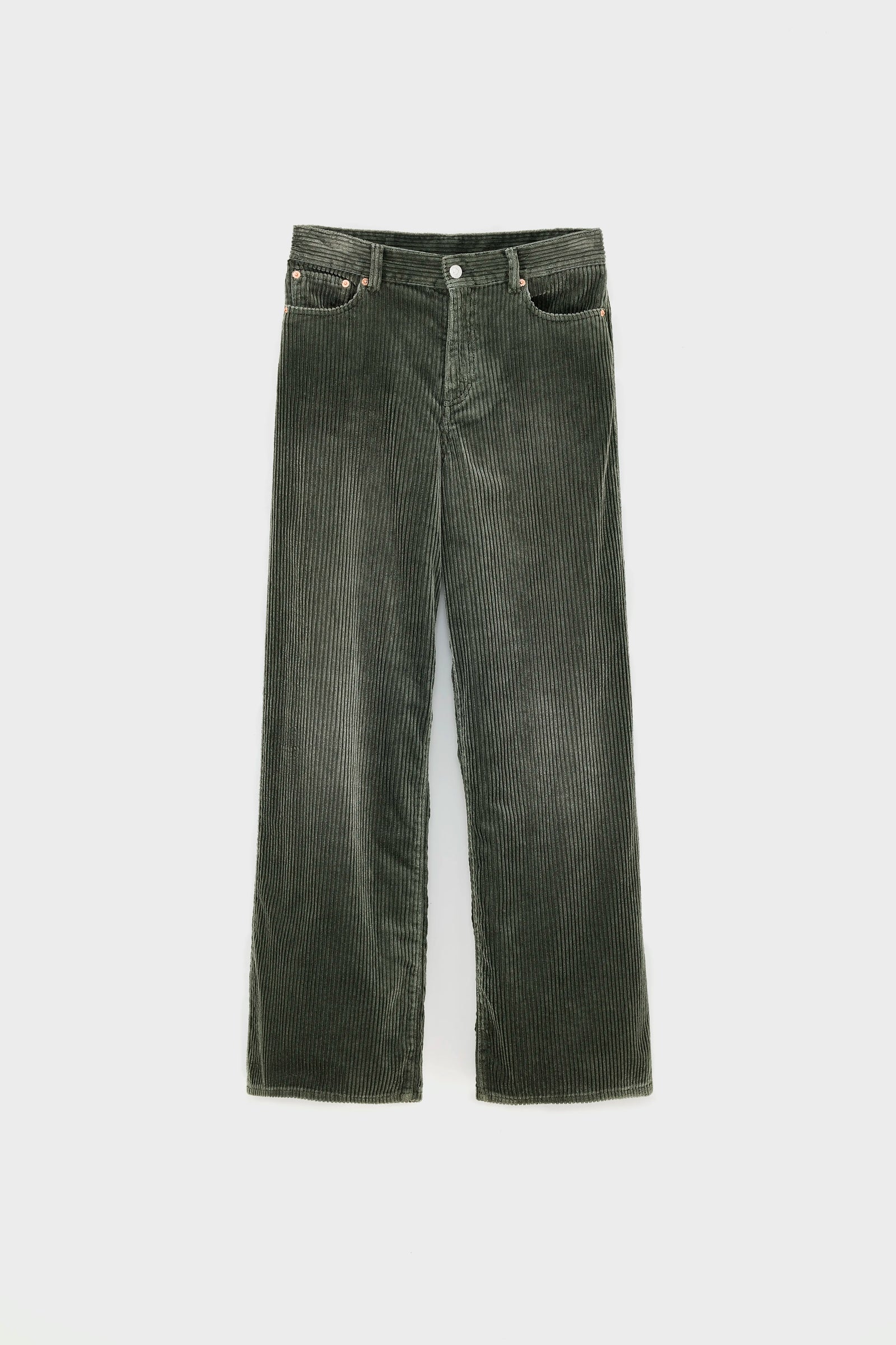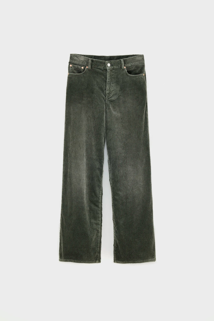 Vaqueros boyfriend de tiro medio y pernera ancha, confeccionados en pana color salvia.