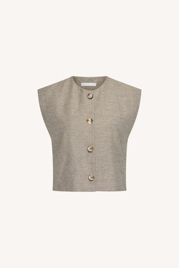 Con un ajuste cómodo y normal y un cuello redondo, este chaleco sin mangas ofrece un aspecto sofisticado. El cierre de botones facilita su uso y combinación, perfecto para un look versátil que te acompañará sin esfuerzo del día a la noche.