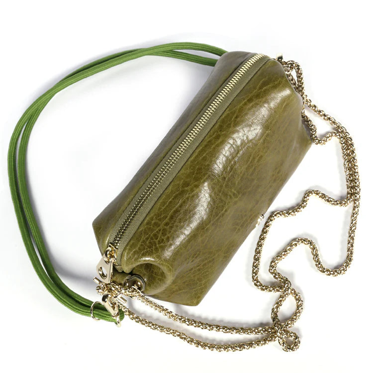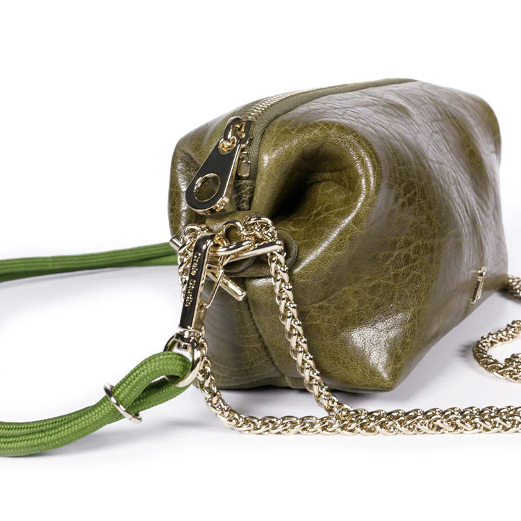 Incluye dos correas de hombro extraíbles para una variedad de estilos: una cadena dorada para un look chic y una cuerda de escalada lisa en color aguacate para un toque más gráfico e informal.