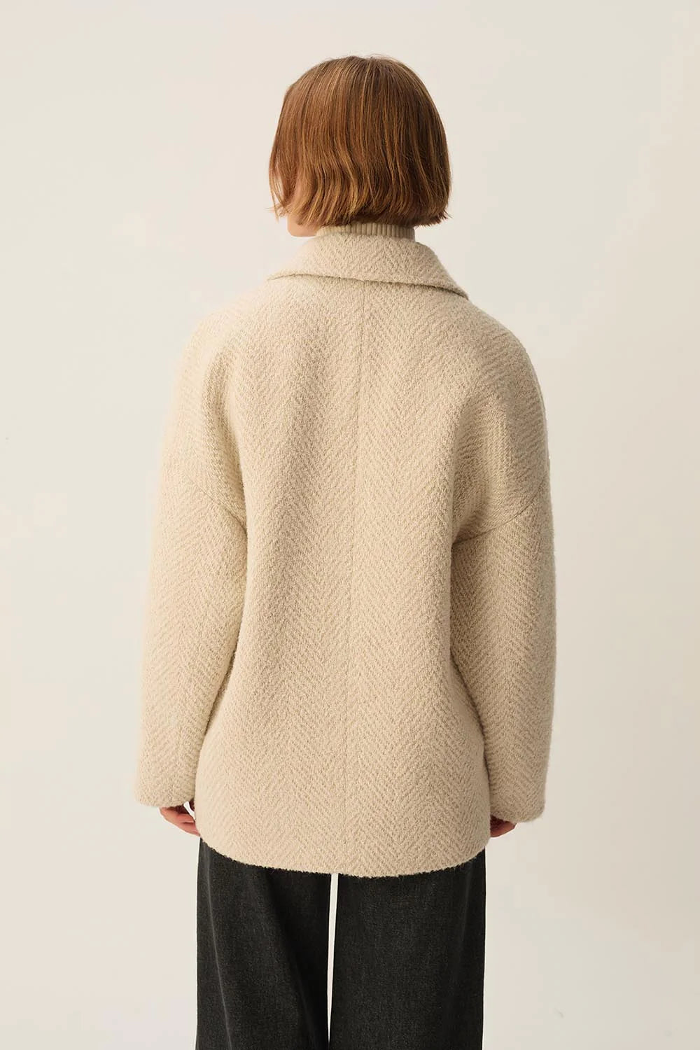 Realzado con un estampado de espiga tono sobre tono, el abrigo midi Yzia es una nueva versión del chaquetón urbano. Con un corte holgado ultramoderno, un cuello sastre amplio y un elegante cierre cruzado con botones, este abrigo cálido y acogedor es imprescindible en cuanto empiezan a bajar las temperaturas.