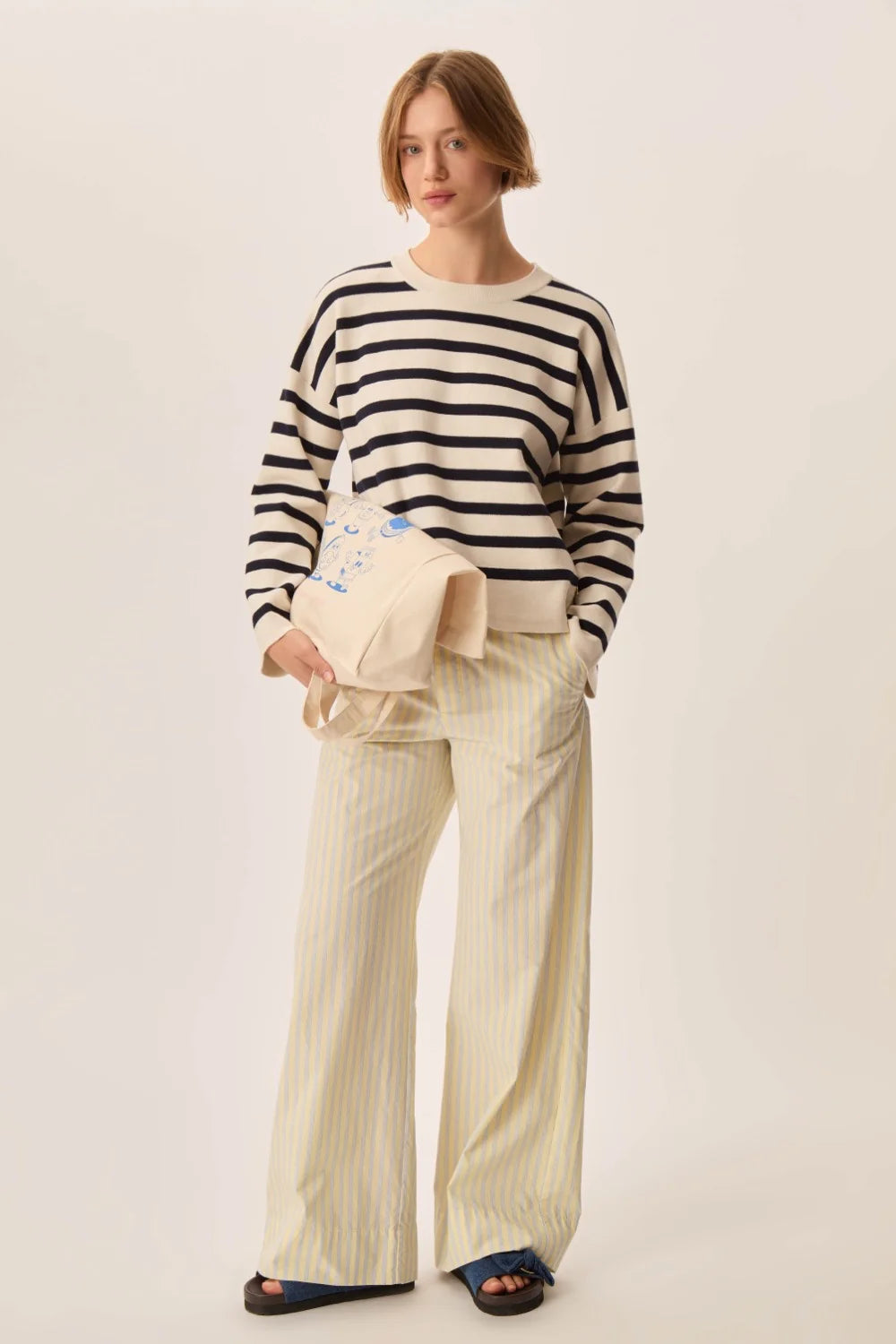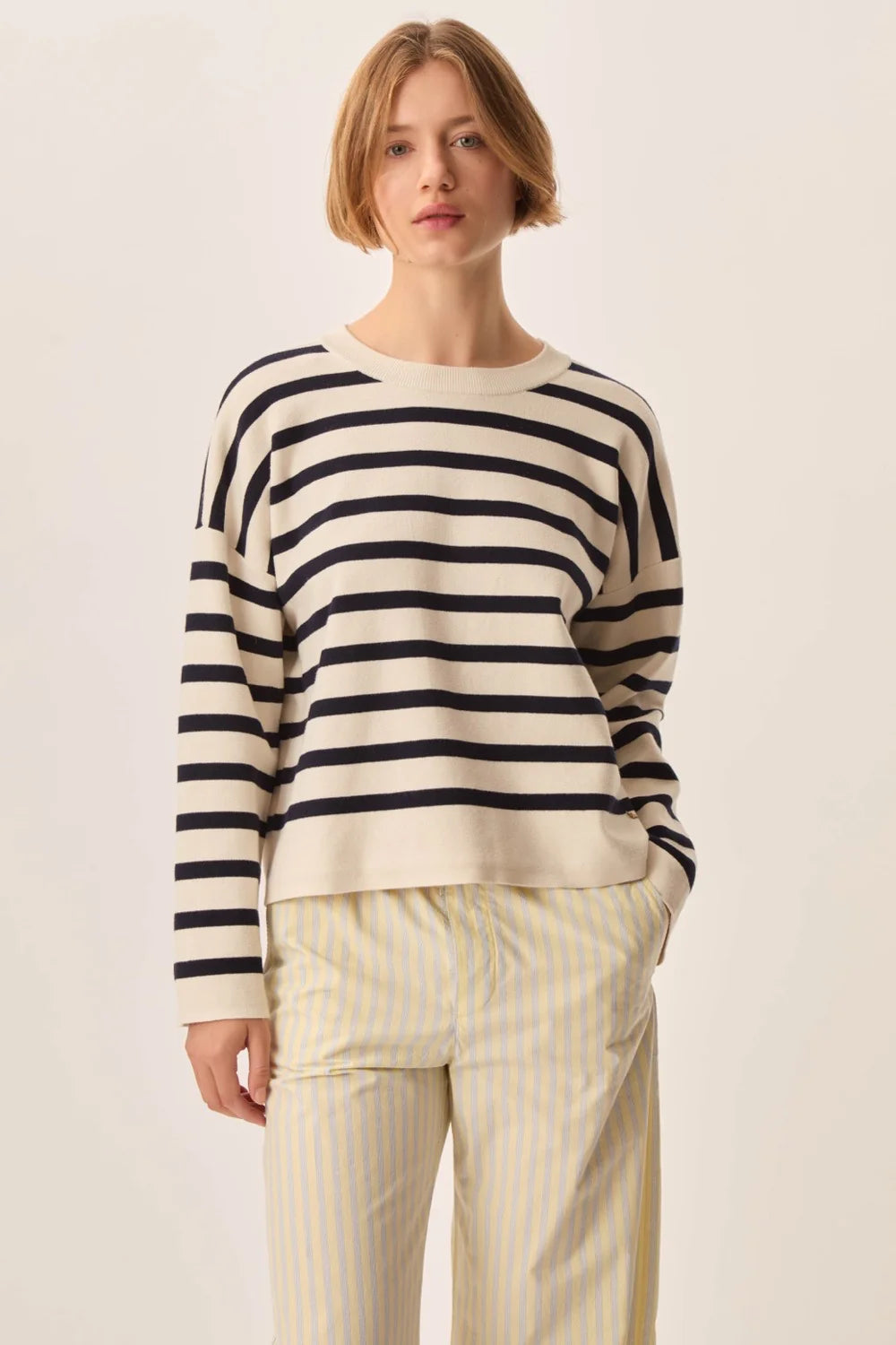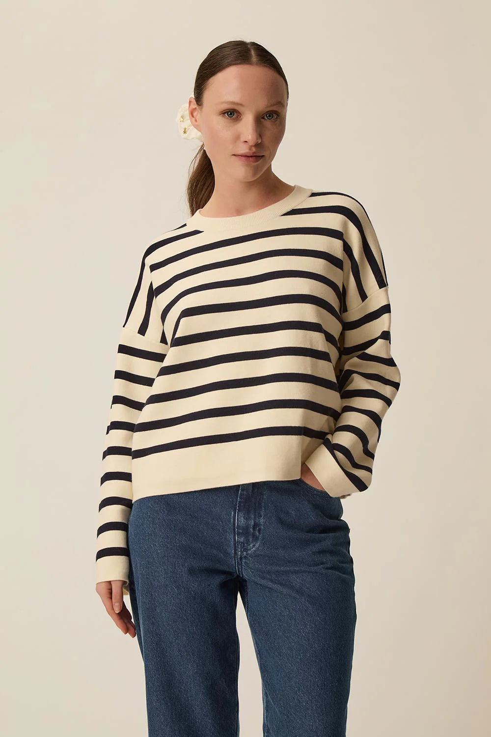 El jersey de rayas Biscote redefine la raya bretona para un look chic y moderno. Con su corte holgado y sisas asimétricas, su punto denso y cómodo, realzado con un toque de cachemira, ofrece comodidad y estructura. Un jersey tan moderno como atemporal, perfecto para la primavera.