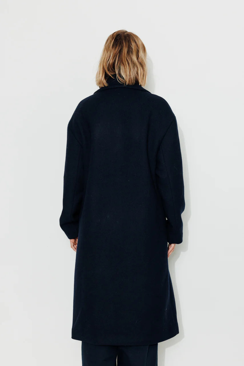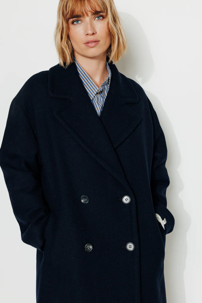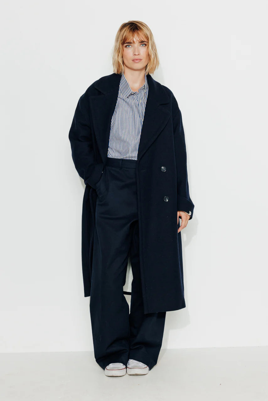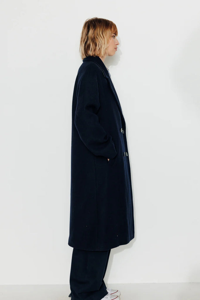 Un abrigo largo y fluido con un look chic y natural: la personificación de la elegancia contemporánea en un azul marino intenso.