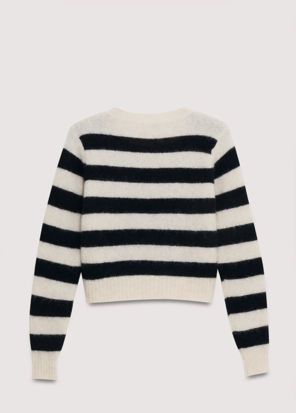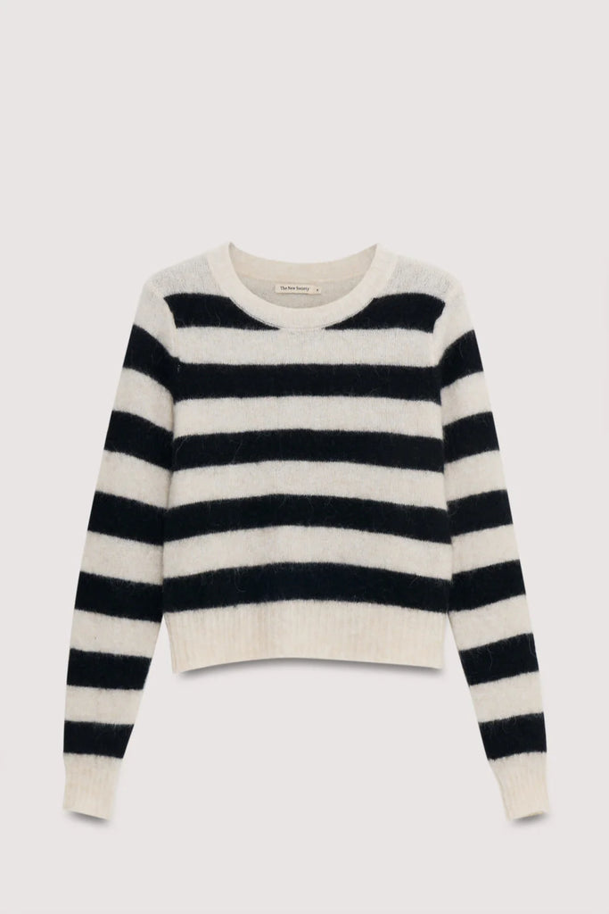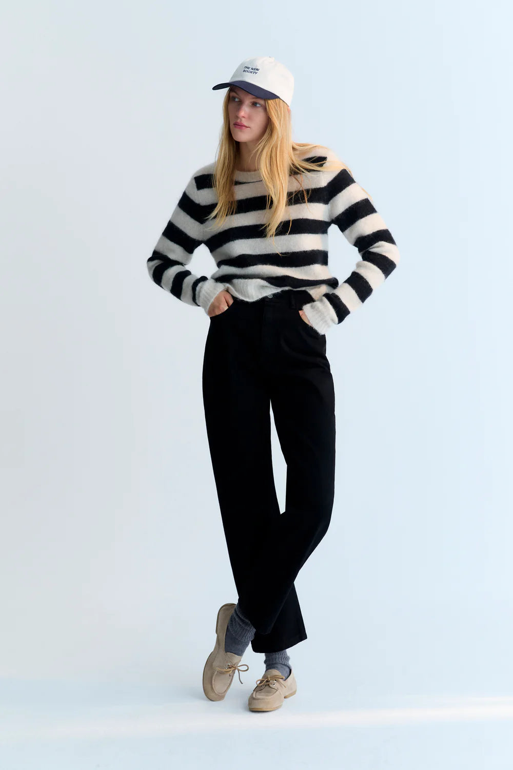 Suéter suave confeccionado en una lujosa mezcla de alpaca y lana merino, con un clásico cuello redondo. Diseñado con una estructura de rayas bicolor que le aporta una textura sutil y un toque visual atractivo, ofreciendo calidez y un estilo refinado.