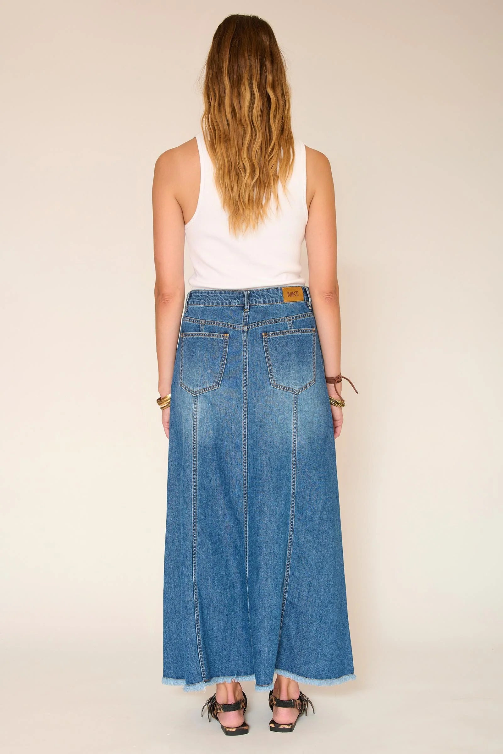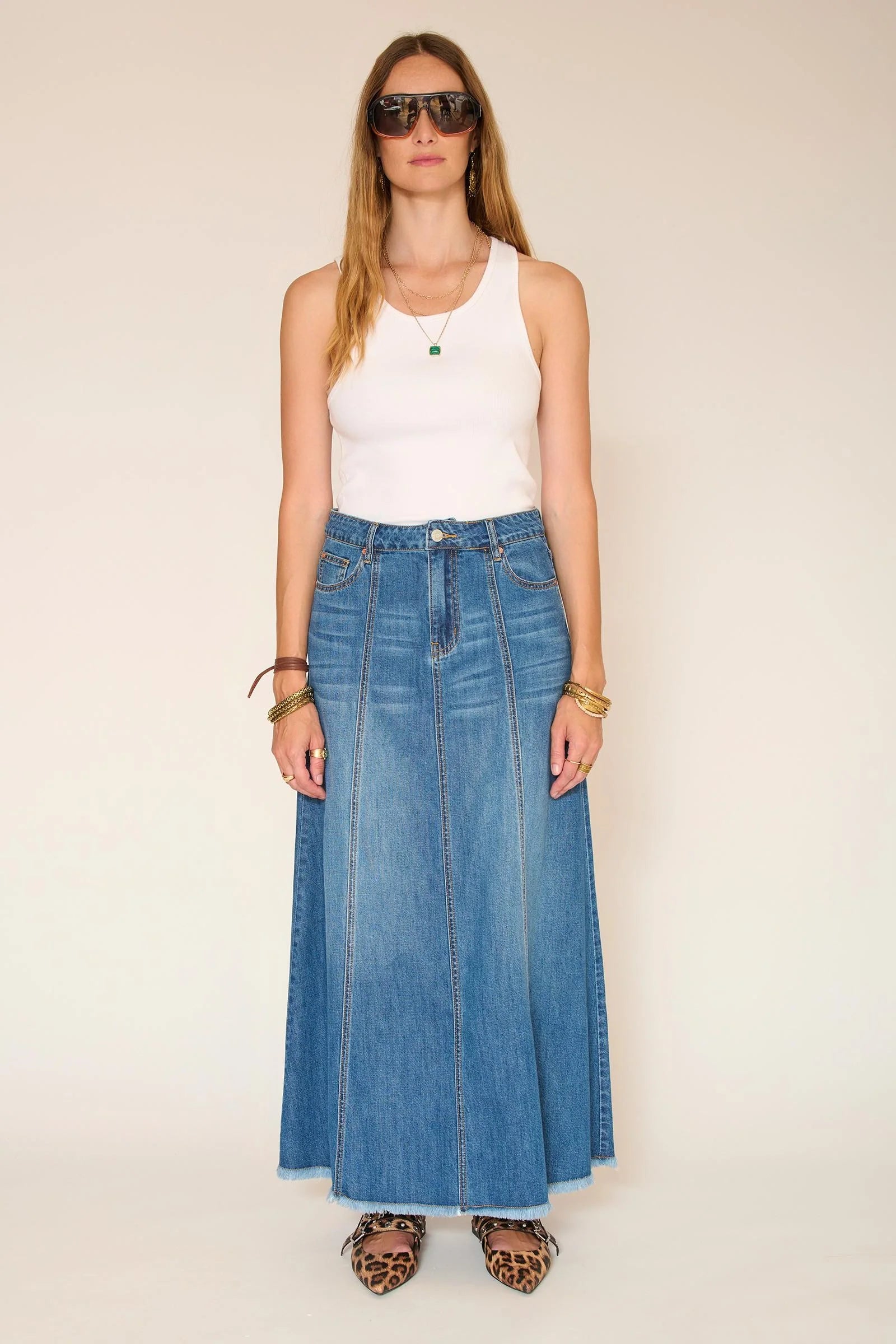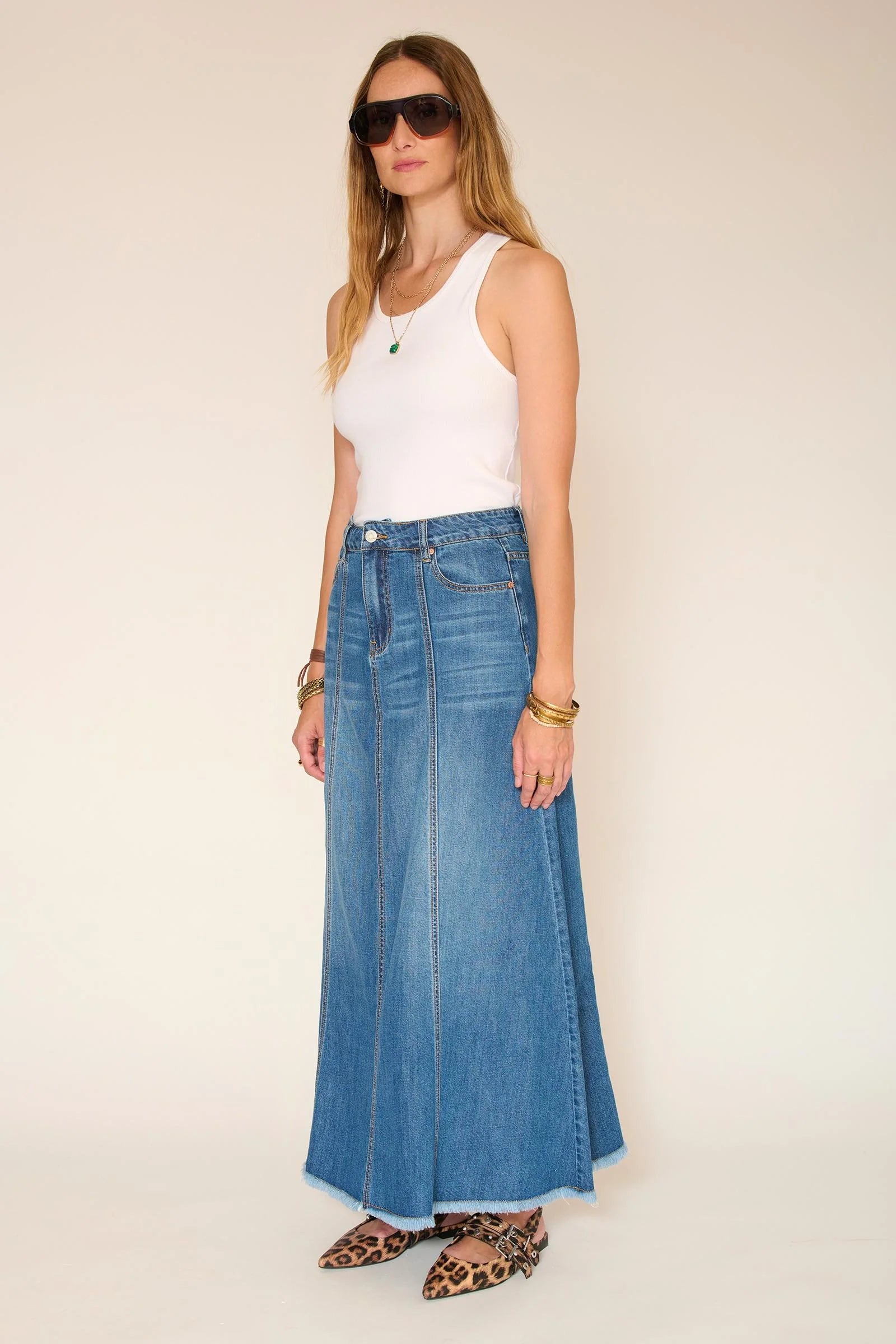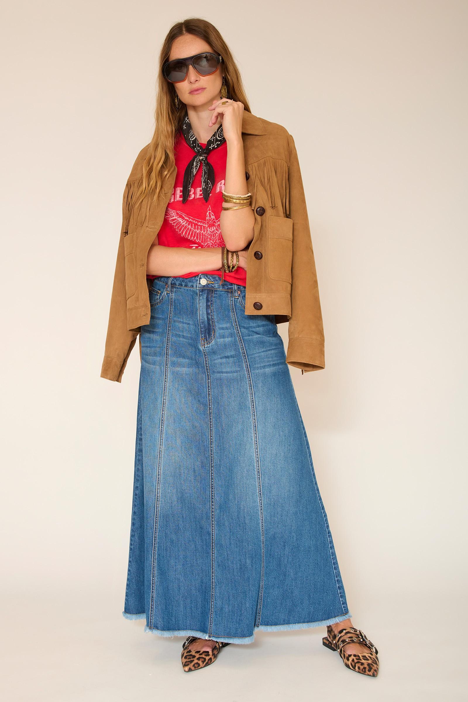 Las costuras verticales estructuran la silueta y alargan sutilmente la línea. Esta falda vaquera presenta un corte largo y fluido con una caída suave que se mueve contigo sin resultar rígida. Fácil de usar a diario, es una prenda clave en cualquier armario, perfecta tanto para looks casuales como formales.