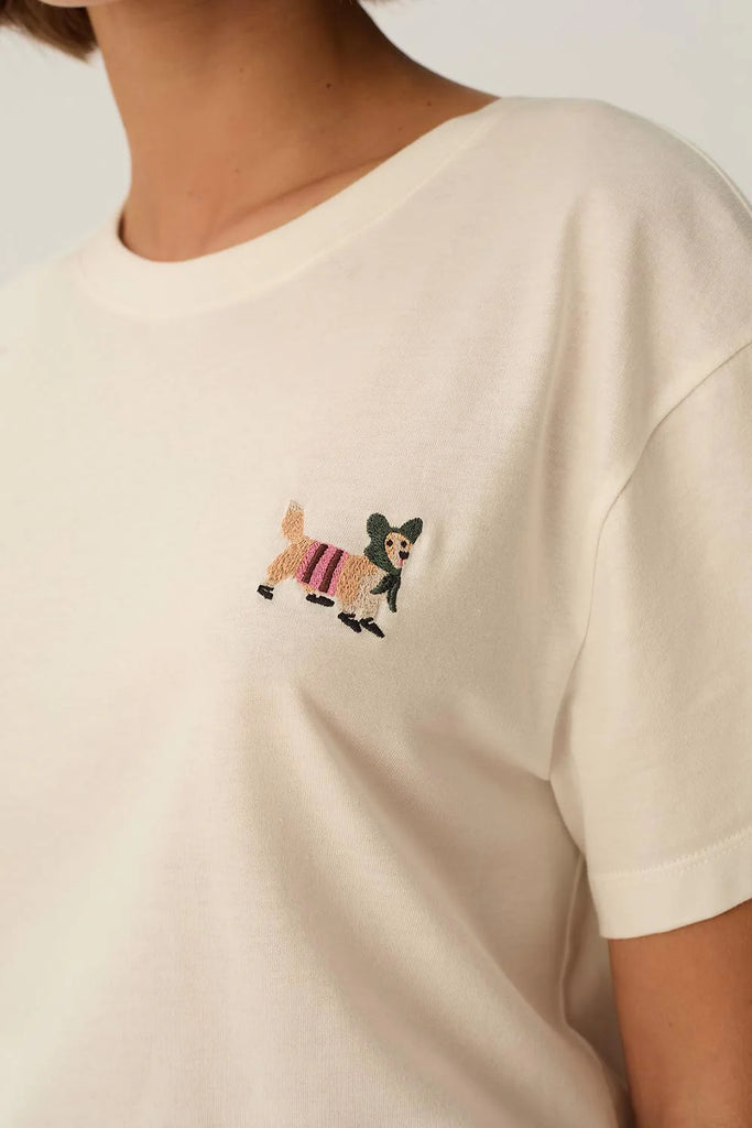 Con su pequeño corgi bordado y su corte clásico, Fantine transforma la camiseta básica en un estilo romántico con un toque divertido y original.