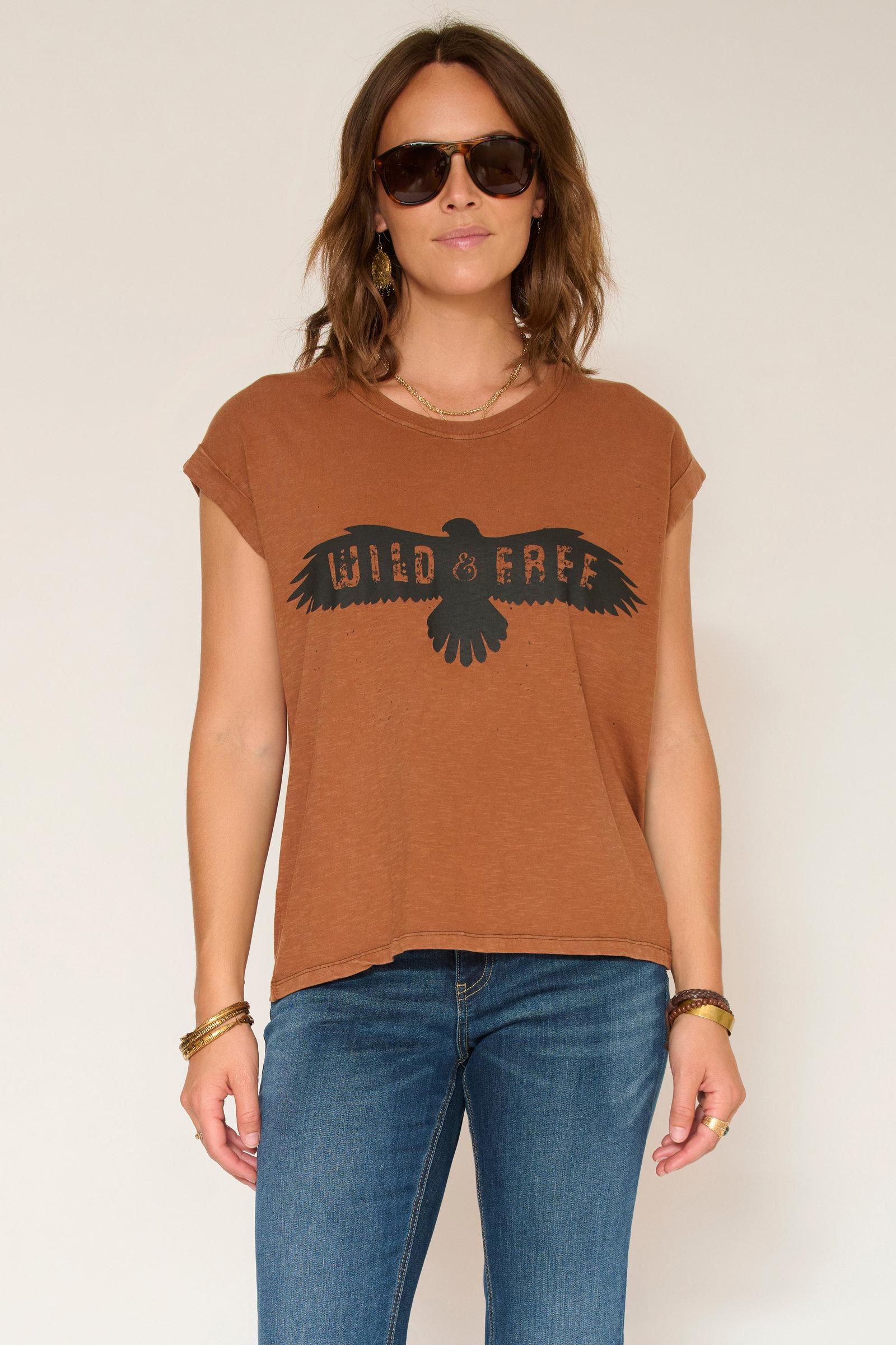 La parte delantera de la camiseta presenta un estampado gráfico de aves , acompañado del texto "WILD & FREE" , que le confiere una personalidad única y original. En la espalda, la parte sencilla y sin estampados mantiene el equilibrio visual, dándole un toque elegante e informal.