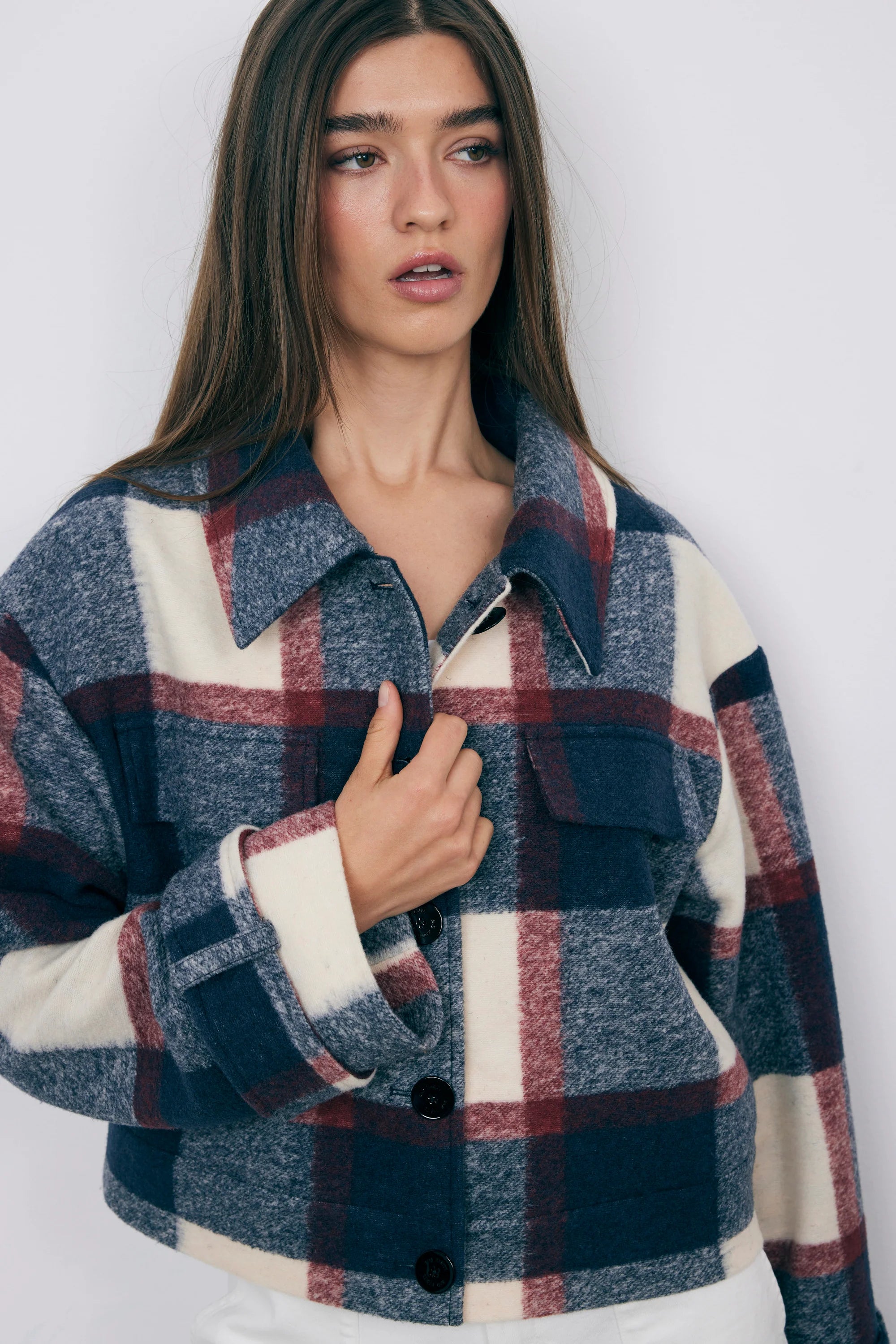 Abrigo Colección Bad Habits. Abrigo corto con estampado de cuadros en azul y burgundy, perfecto para añadir color y personalidad a tus looks de invierno.