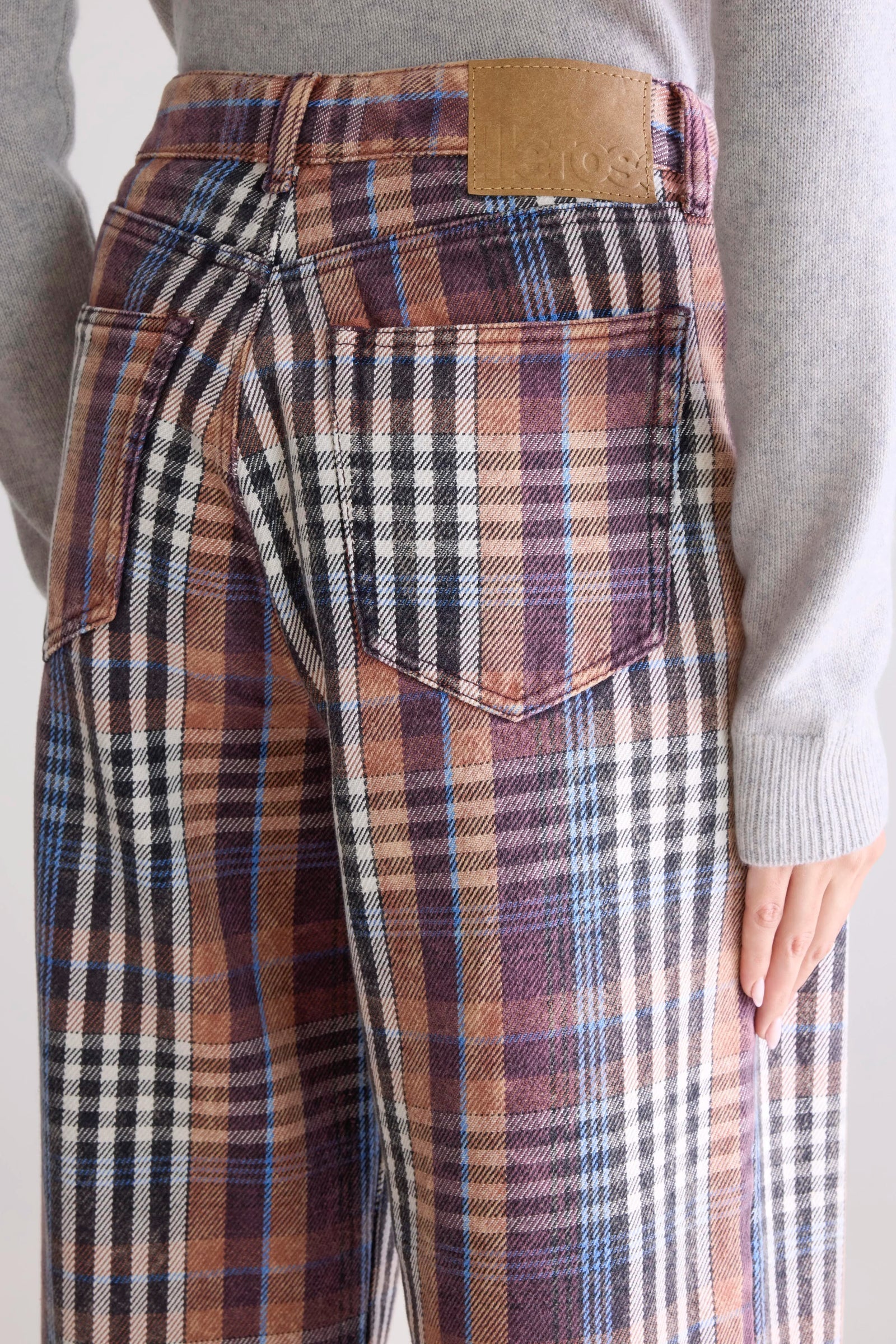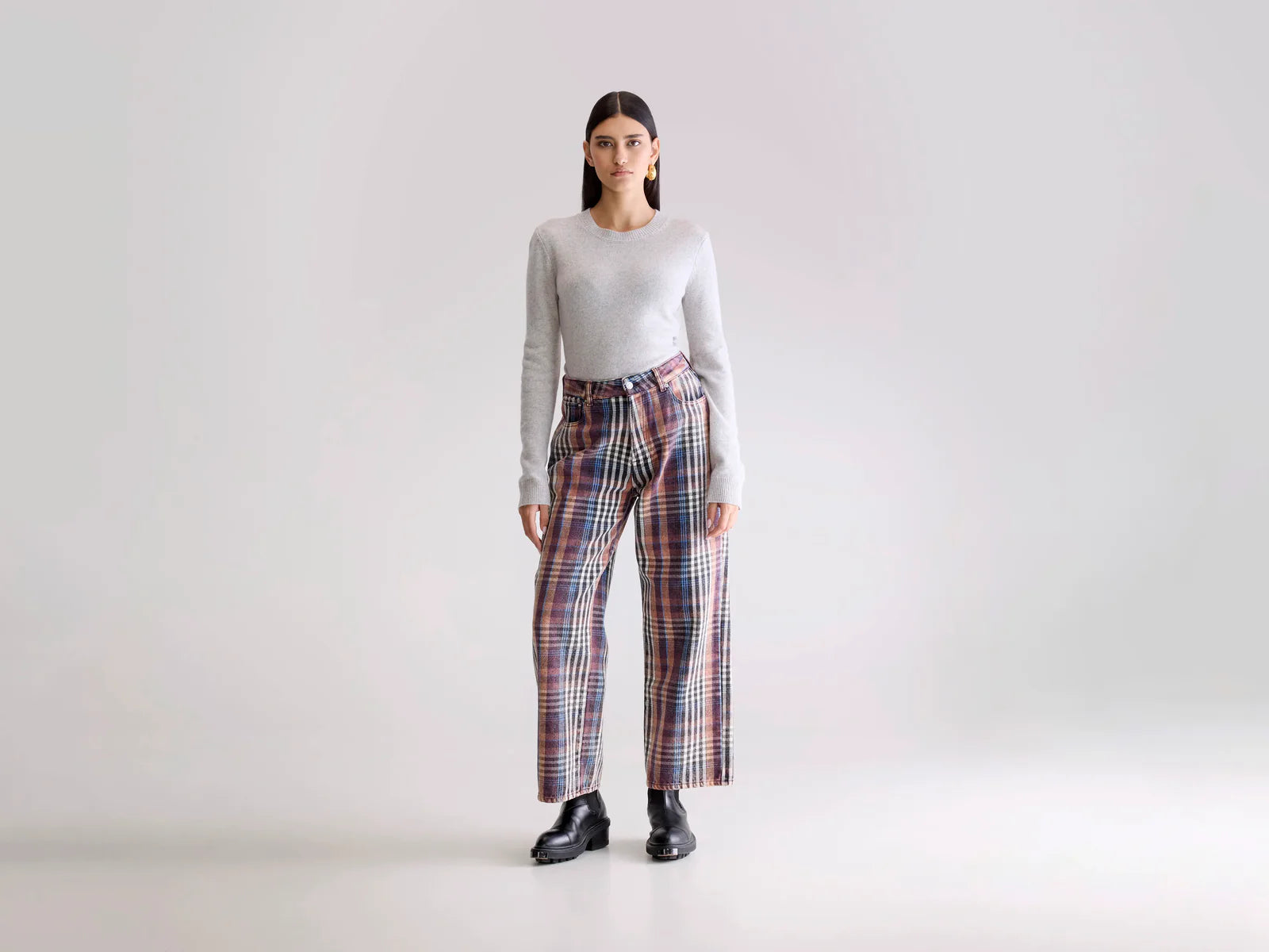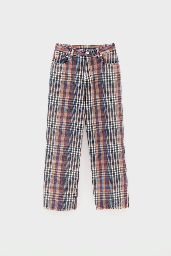 Vaqueros holgados de tiro bajo y pernera ancha, confeccionados en algodón a cuadros en tonos cálidos marrón óxido, burdeos intenso, negro y blanco roto.