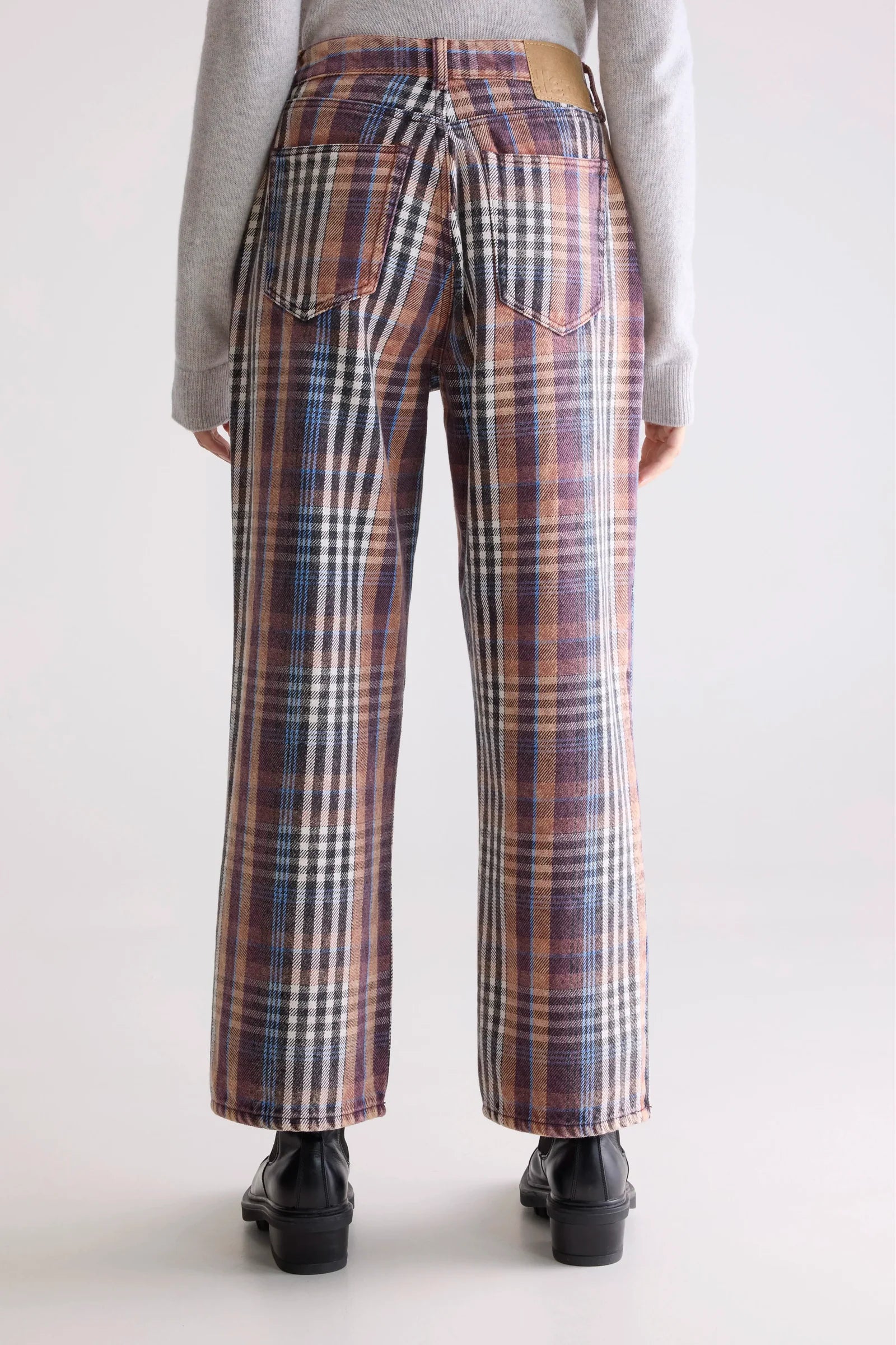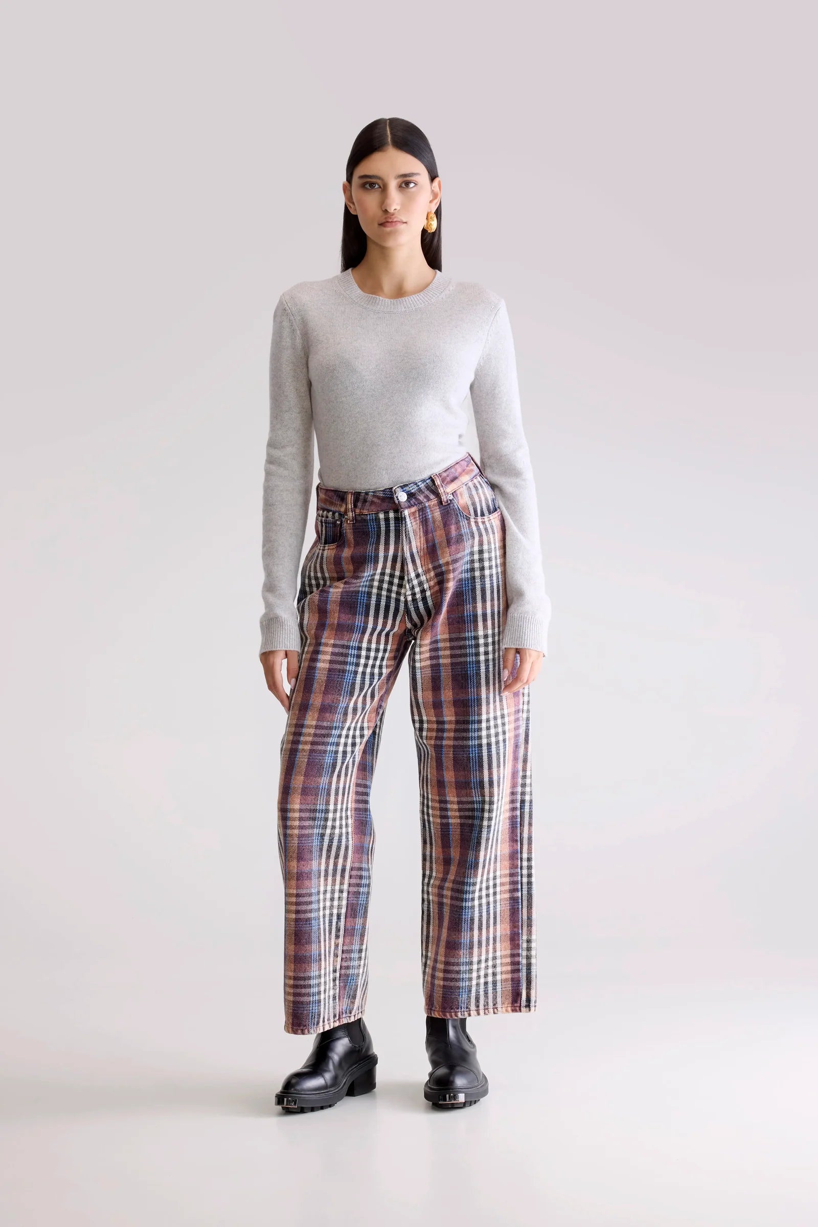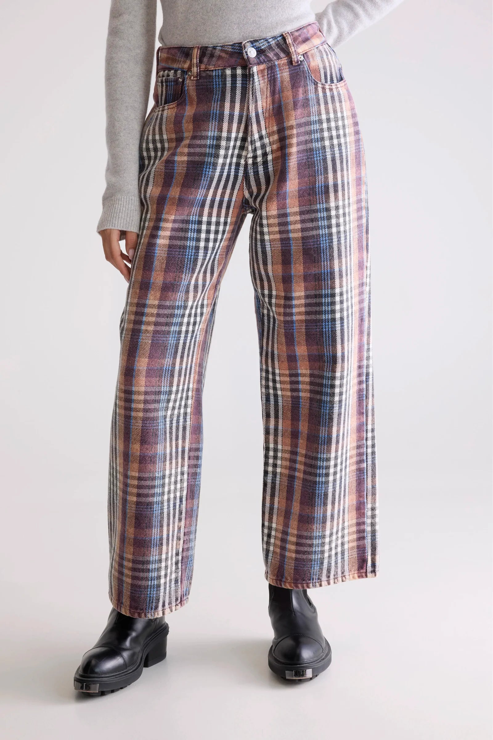 Vaqueros holgados de tiro bajo y pernera ancha, confeccionados en algodón a cuadros en tonos cálidos marrón óxido, burdeos intenso, negro y blanco roto.