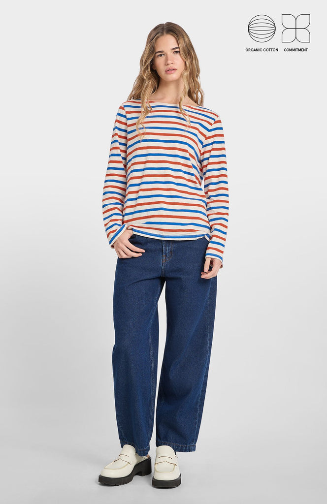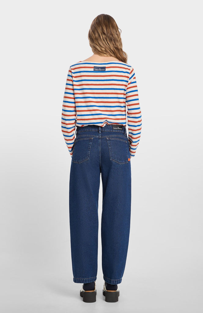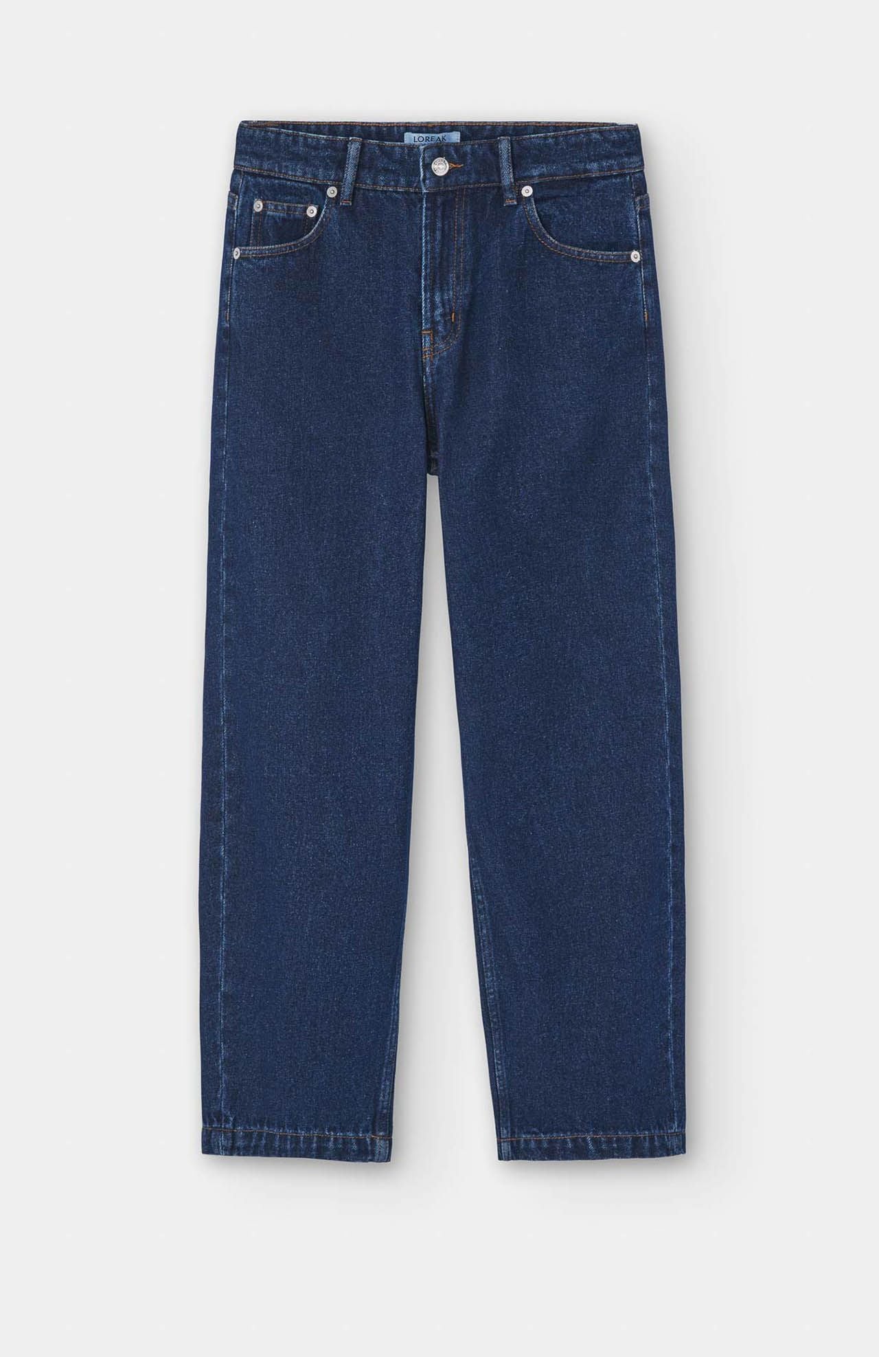 Un pantalón denim excepcional de cinco bolsillos confeccionado con suave algodón orgánico, de tiro alto y un estilo "tapered fit” que se adapta al cuerpo a la perfección. Su cierre frontal de botón y cremallera añade un toque de practicidad, mientras que los detalles en contraste en los laterales y el bolsillo trasero, junto con la etiqueta de marca en la cintura, destacan su atractivo.