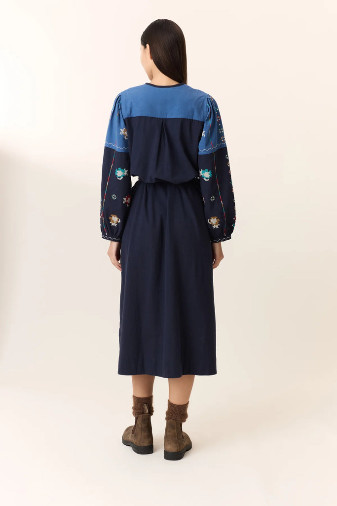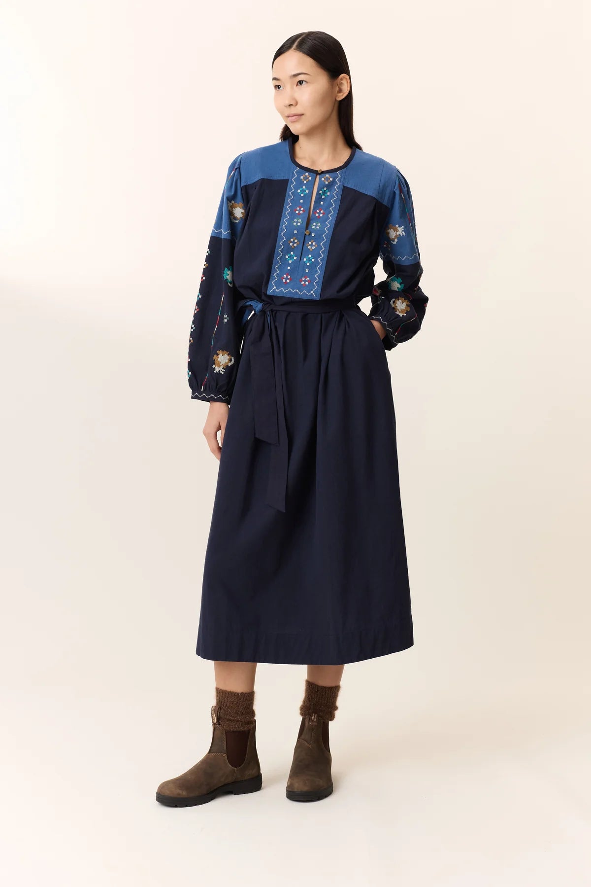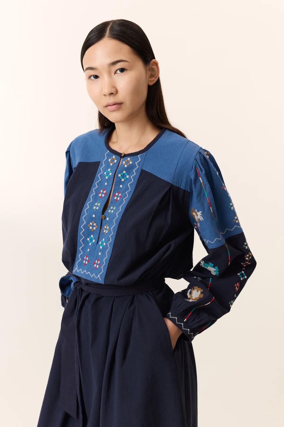 Silueta fluida y largo midi, diseñado para combinar movimiento y un look relajado. Un bordado gráfico y floral estructura el peto, que se extiende hasta las mangas largas. Los puños ajustados, los hombros ligeramente acentuados y el cinturón extraíble te permiten ajustar y resaltar la cintura. Confeccionada íntegramente en algodón, promete un ajuste natural y una sensación agradable en el día a día.