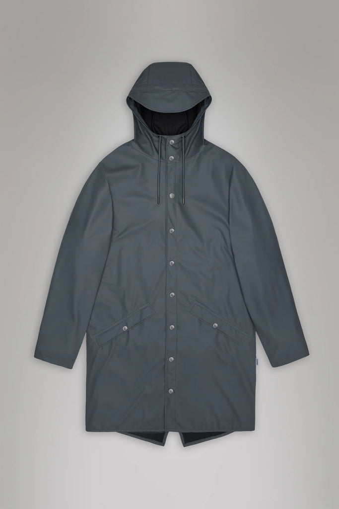 Este impermeable es la versión larga del clásico impermeable de Rains. Presenta una tapeta con botones de presión, capucha con visera incorporada y dos bolsillos laterales con botones automáticos. Las mangas presentan botones de presión que permiten ajustarlas para que queden sueltas o recogidas.
