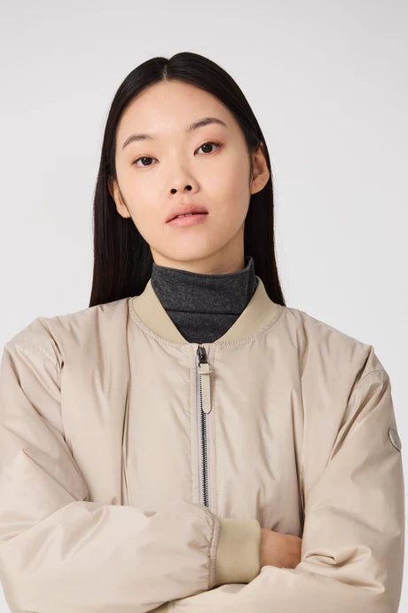 Estilo chaqueta bomber con puños y cuello de canalé.