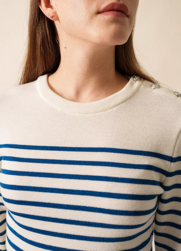Más ligero y suave que el auténtico jersey marinero, el jersey Marée conserva todas sus características icónicas: corte entallado, cuello redondo y botonadura en el hombro. Una prenda atemporal y elegante.