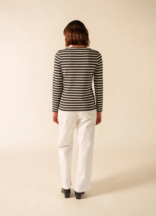 Con su auténtico tejido de algodón cardado, la camisa Meridame es la versión femenina de la original camisa marinera de rayas. Con su escote redondo y su corte regular, es una prenda cómoda y fácil de llevar. - Punto grueso