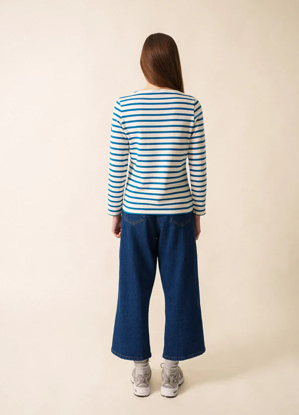 Con su auténtico tejido de algodón cardado, la camisa Meridame es la versión femenina de la original camisa marinera de rayas. Con su escote redondo y su corte regular, es una prenda cómoda y fácil de llevar.