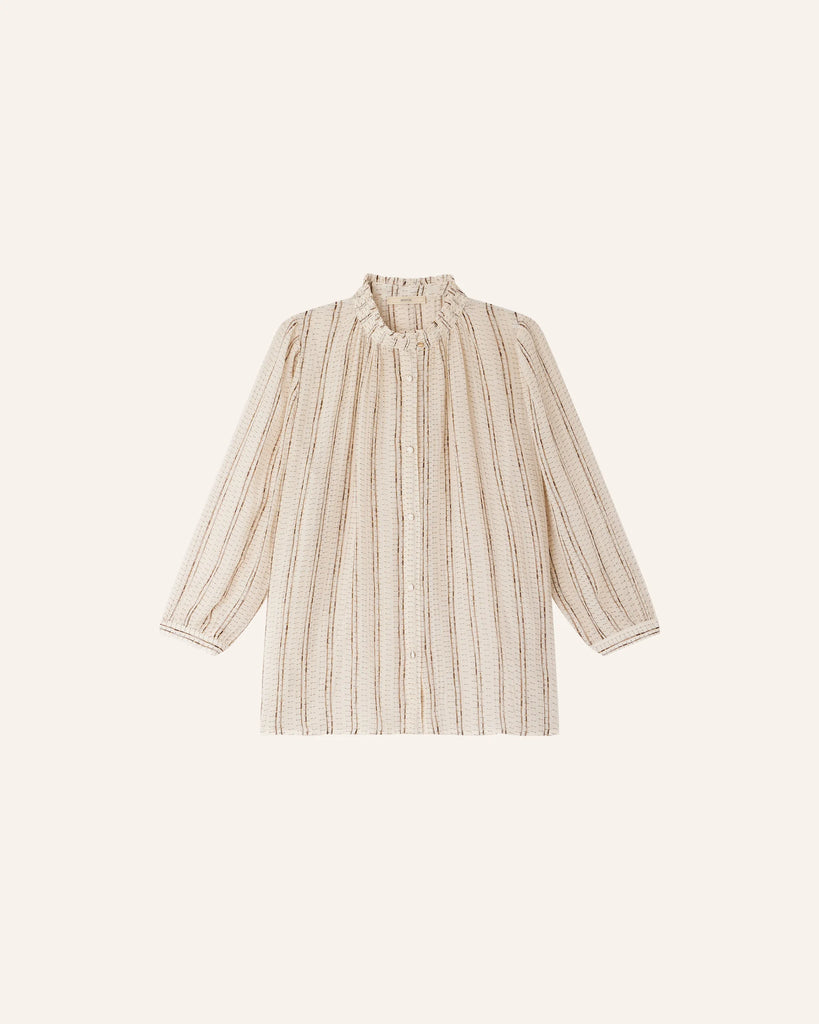 Blusa en crespón de gasa de seda y viscosa estampado con finas rayas metalizadas, motivo exclusivo Sessùn.