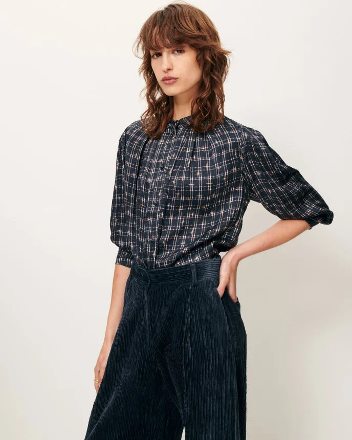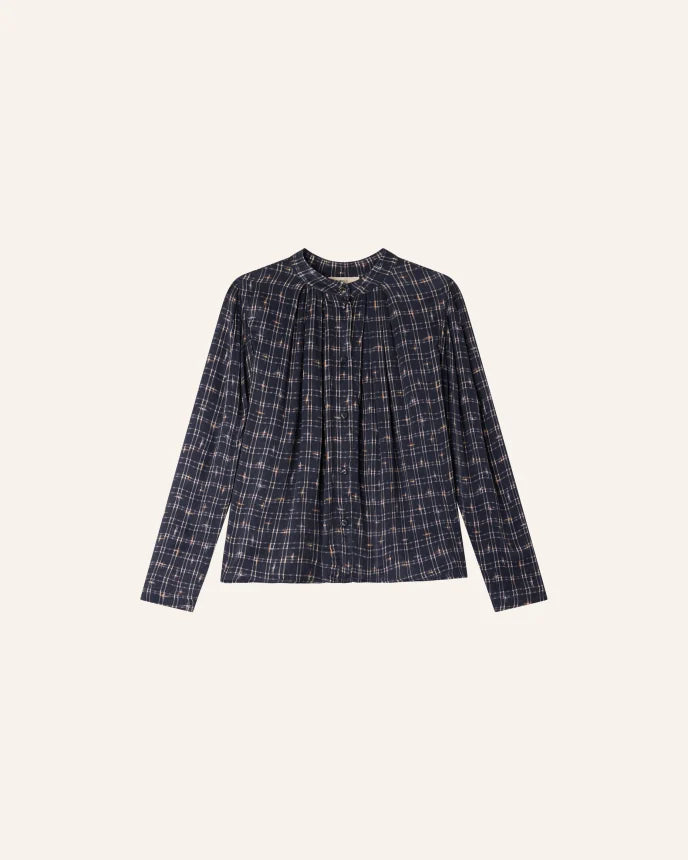 Blusa ajustada en tela satinada y ligera, motivo exclusivo Sessùn.