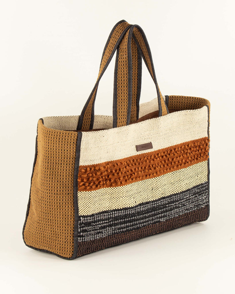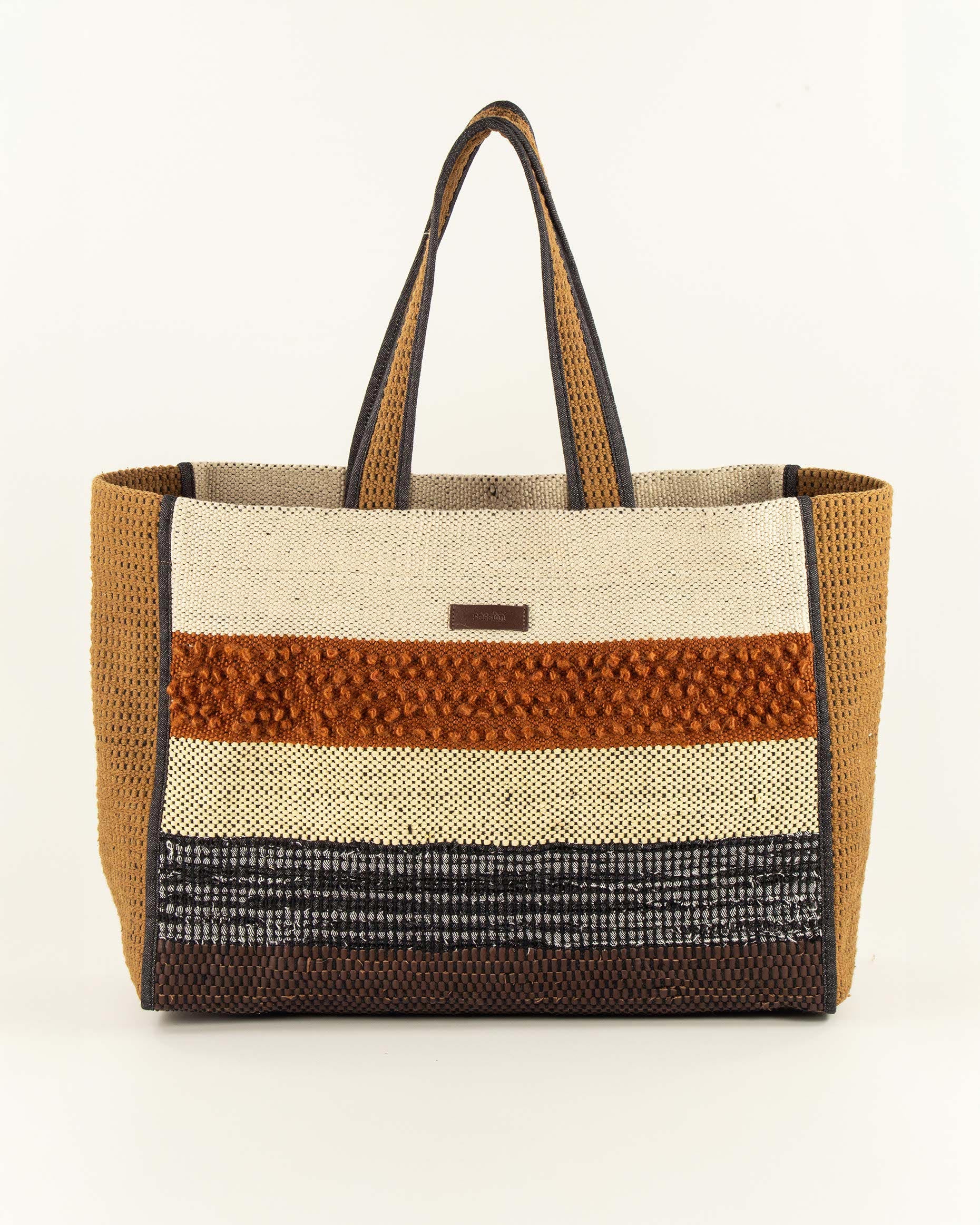 Bolso shopper grande en tejido fantasía y mezcla de materiales, motivo exclusivo Sessùn.