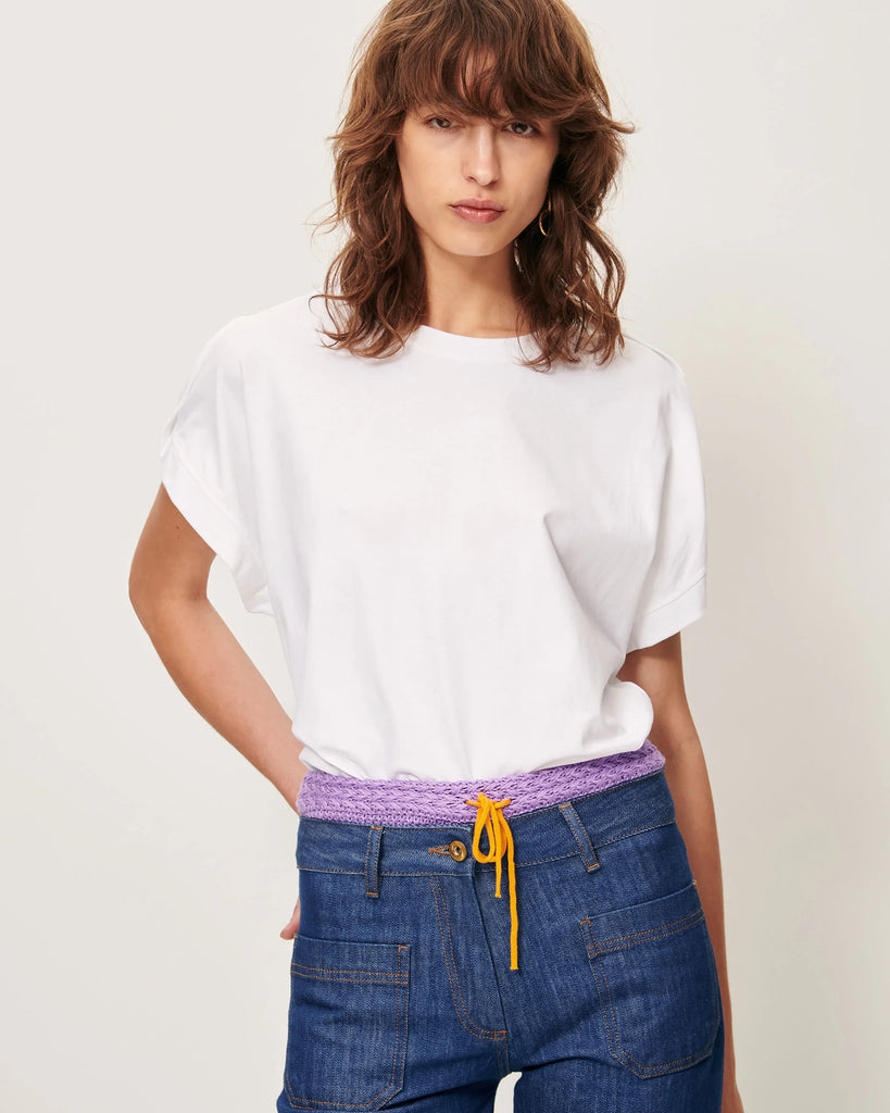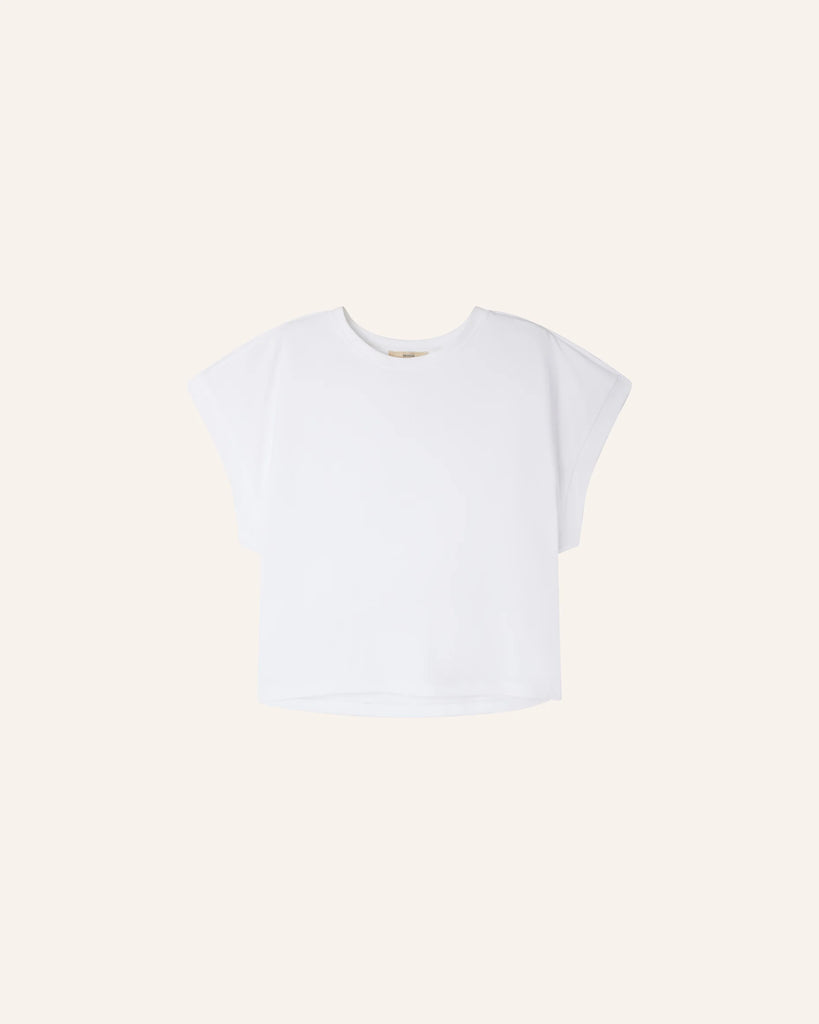 Camiseta amplia y corta con solapa en el hombro, confeccionada en Portugal.