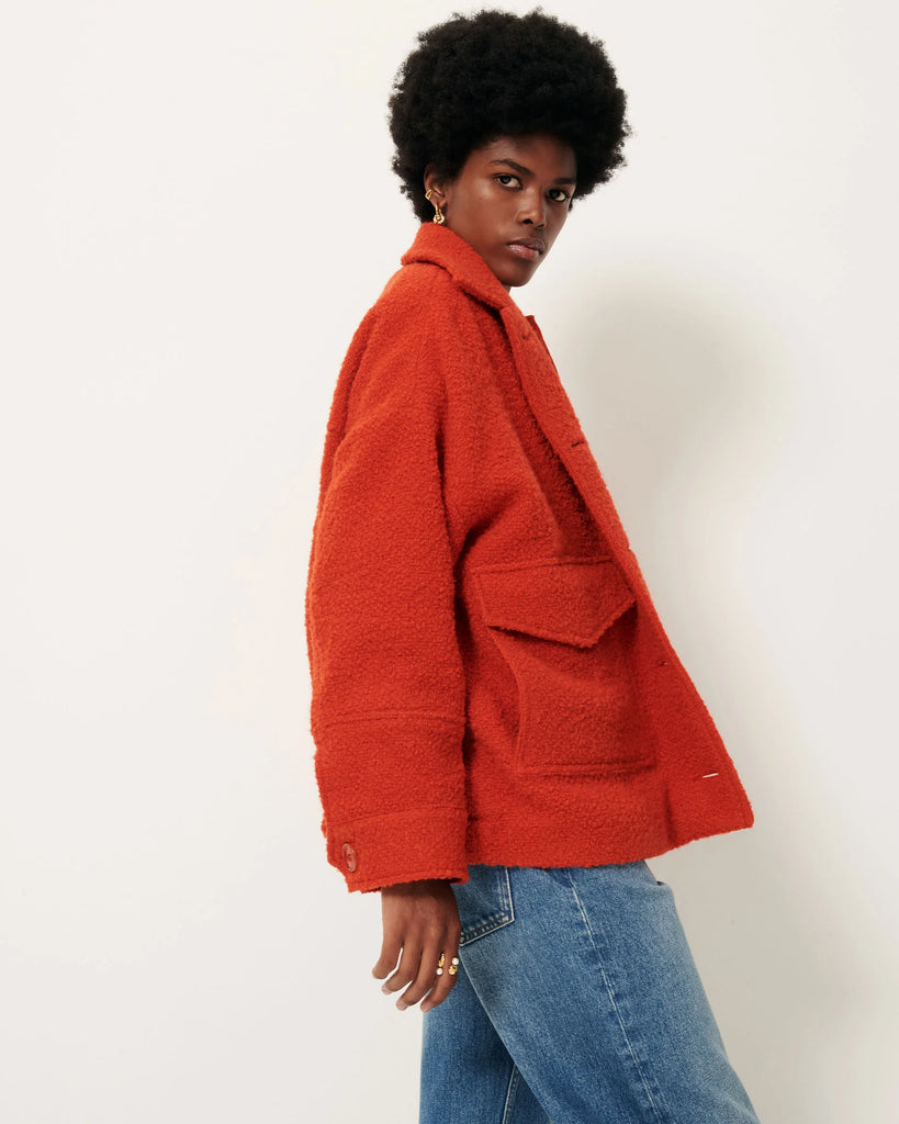 Abrigo corto en lana trenzada gruesa con hilos rizados teñidos, tejido en Italia.