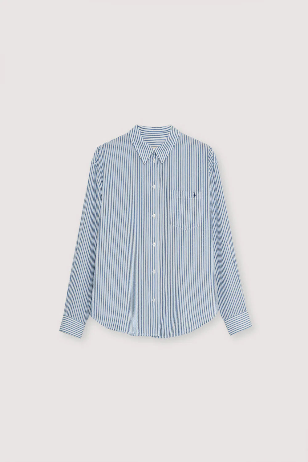Una camisa fluida confeccionada en suave tejido tencel con una refinada raya bicolor. Diseñada con un bolsillo de parche frontal y un sutil bordado de la marca, ofrece un equilibrio moderno entre comodidad y elegancia.