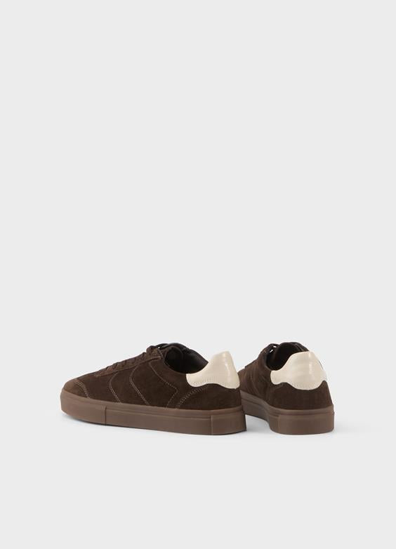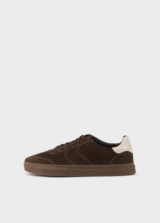 La zapatilla deportiva con suela cupsole esencial para el día a día. La parte superior está confeccionada en ante marrón oscuro, con un refuerzo del talón en contraste de cuero beige. Los detalles incluyen cierre de cordones y plantilla de cuero.