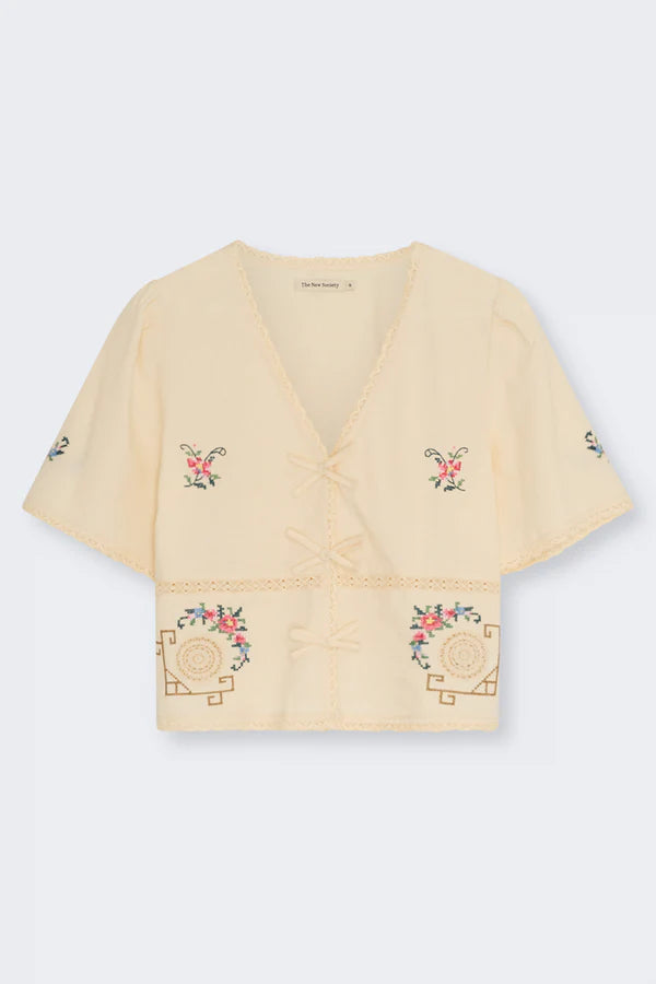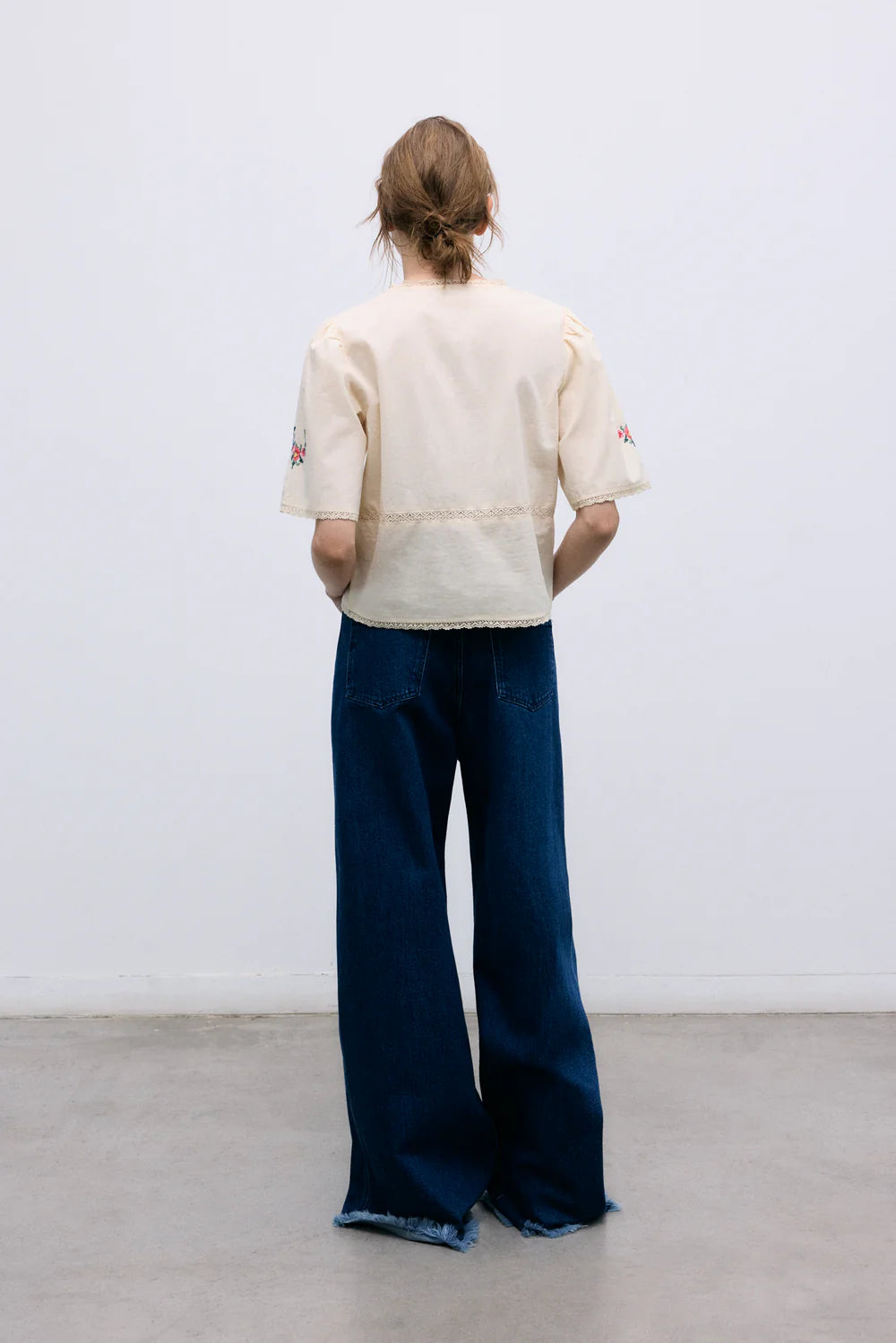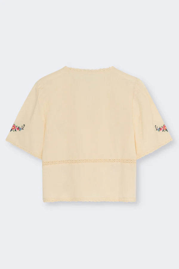 Confeccionada en suave algodón 100 %, esta blusa presenta un favorecedor escote en V y una abertura frontal con delicados cierres de lazo. Con detalles de encaje, un intrincado bordado y un panel de crochet hecho a mano, es una prenda con un precioso detalle que combina a la perfección con la falda a juego.