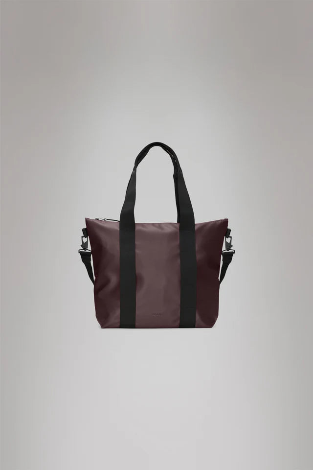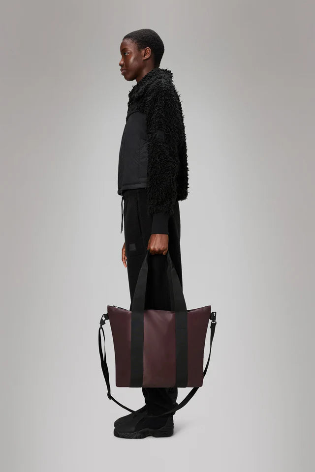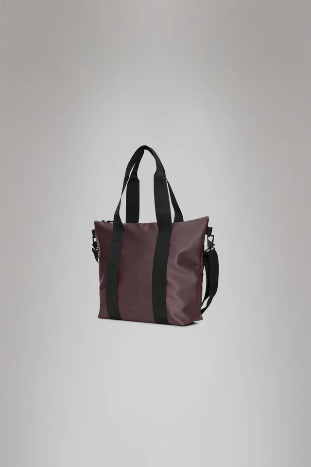Tote Bag Mini está confeccionado en el tejido de PU característico de Rains, diseñado para ofrecer robustez en el transporte, durabilidad y un suave acabado.